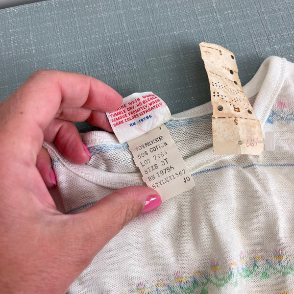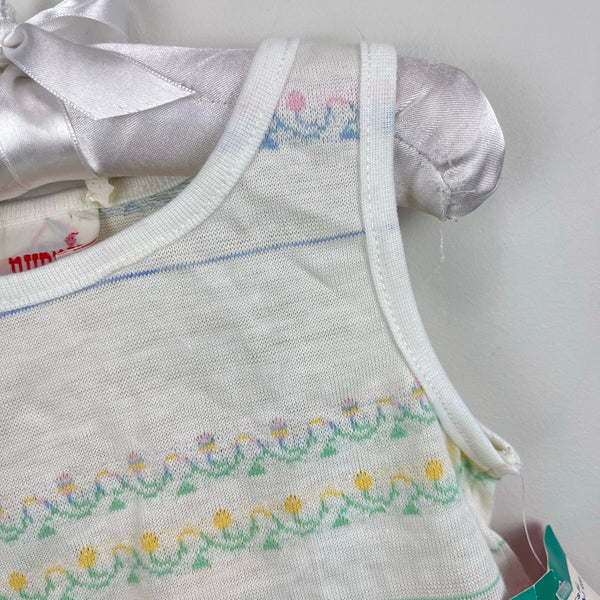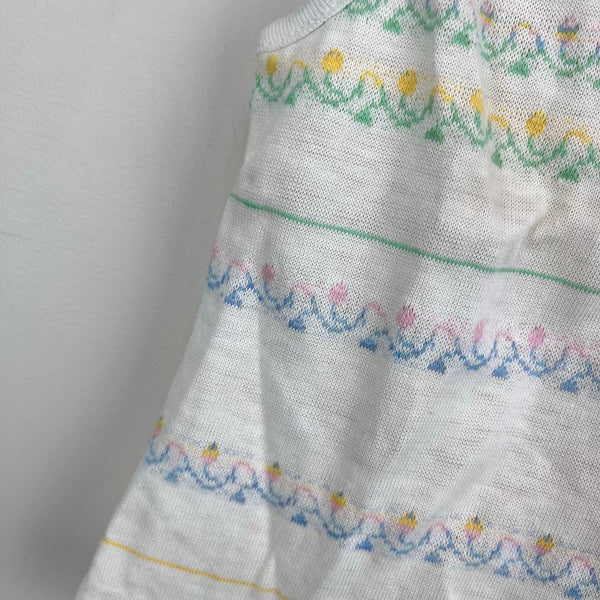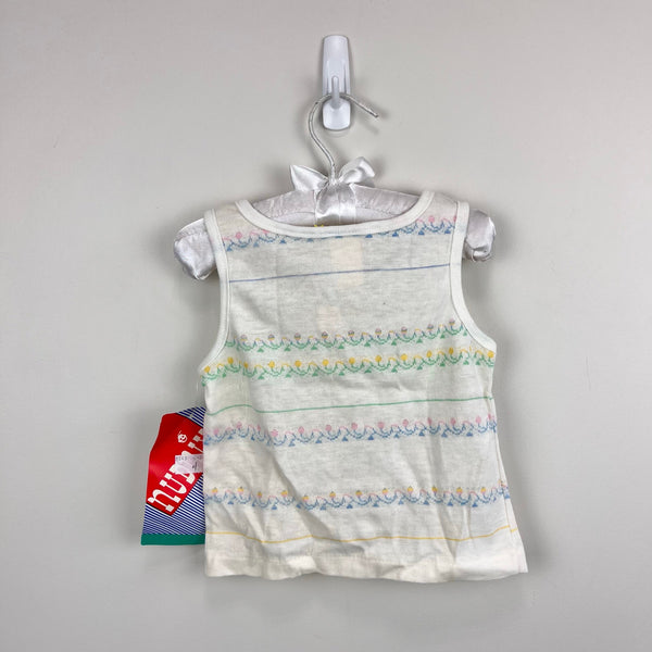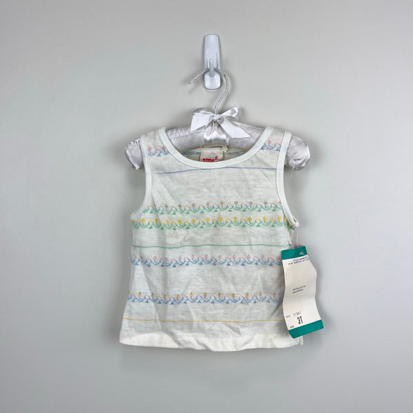 Vintage Nudnix Pastel Flower Tank Top. Toddler girl size 3T. Dead stock, brand new with tags (NWT). Sleeveless white shirt with pretty pink, yellow, blue, and green stripe design.