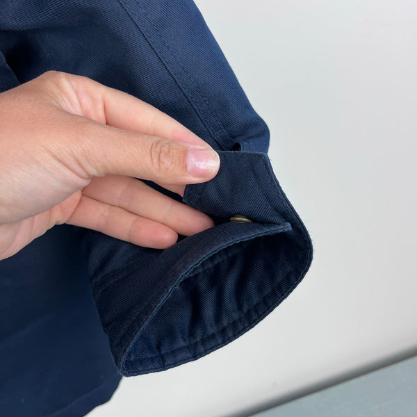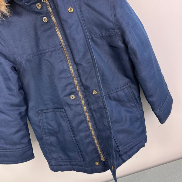Gap Kids Cold Control Utility Parka Coat Elysian Blue. Toddler boy size extra small (4-5 years). Winter jacket in soft navy blue cotton canvas with detachable faux-fur trim on hood. Hidden zip and snap front. Water resistant fabric. Excellent condition with no flaws noted.