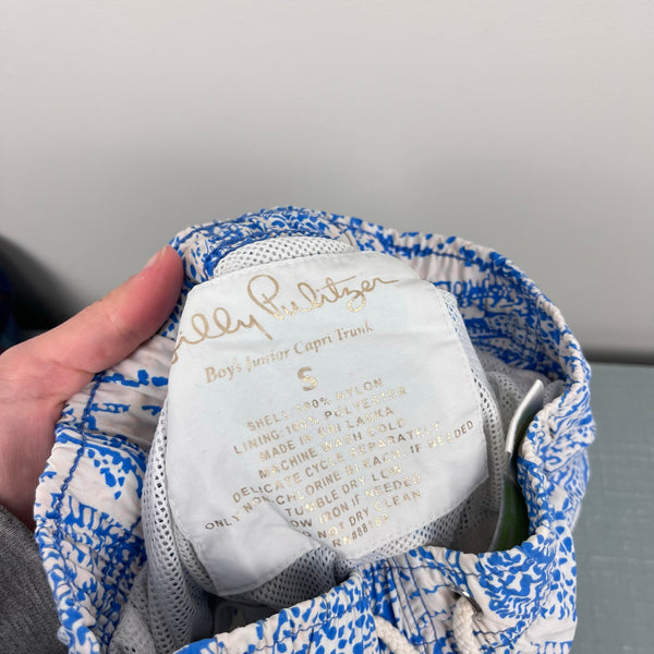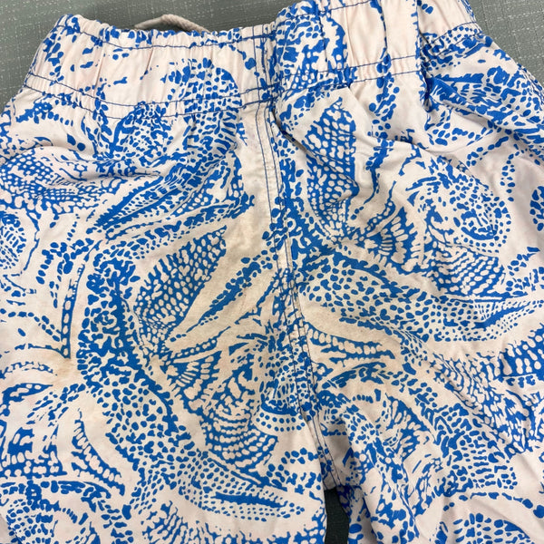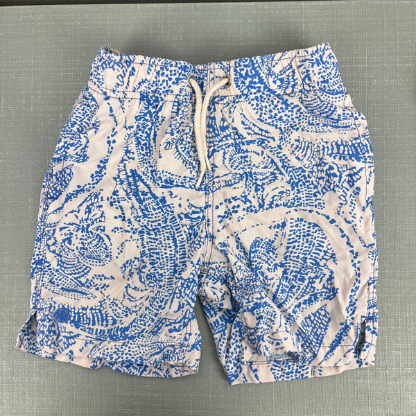 Lilly Pulitzer Boys Junior Capri Swim Trunks Coastal Blue Maybe Gator. Toddler boy size small (4-5 years). Preppy bathing suit shorts in light pink and blue alligator print. Mesh lining and pockets. Has fading and marks/discoloration on the back (see close up photo), but still so cute!