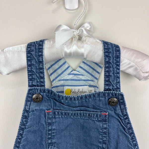 Mini Baby Boden Blue Jean Dungarees Shortalls. Toddler boy or girl size 3-4 years. Classic denim shorts overalls with adjustable snap straps and soft jersey lined top. Lightweight (not stiff) and perfect for every day play!