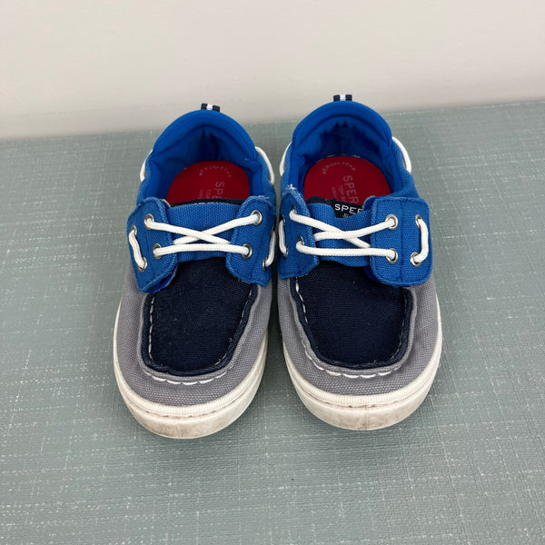 Sperry Sea Ketch Washable Sneaker Boat Shoe. Little boys shoe size 11. Navy, blue and gray canvas upper with white rubber sole. Memory foam insoles. Easy velcro closure. So cute and comfortable for an active kiddo! Light wear and marks on the bottoms (see photos). Washable!