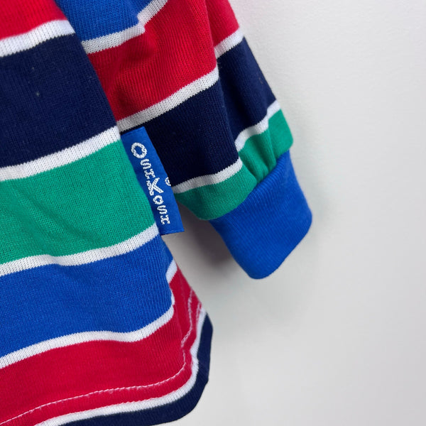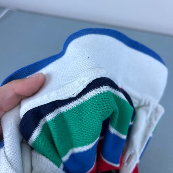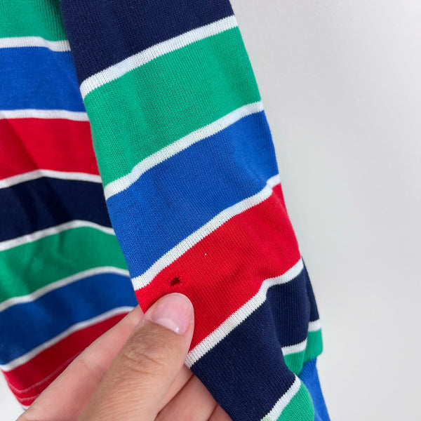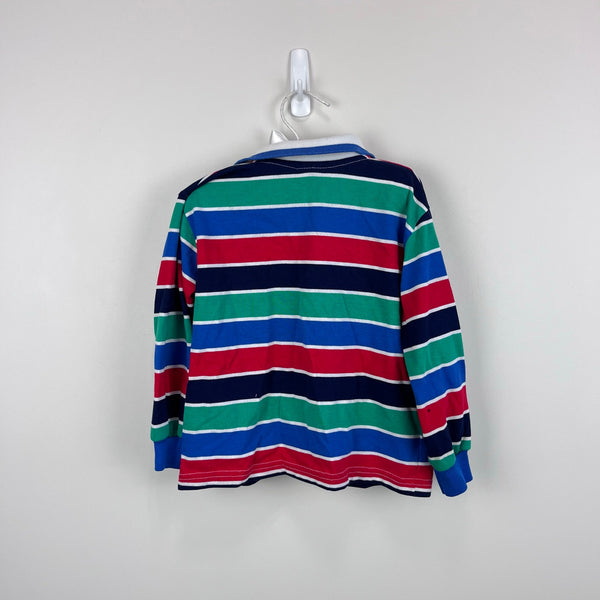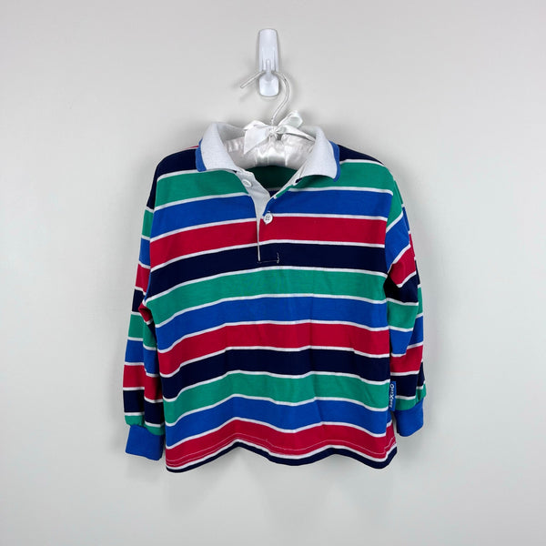 Vintage OshKosh B'gosh Striped Long Sleeve Polo Shirt. Tag removed, but measures about the same as other OshKosh 4T tops; see photos for measurements. Long sleeve collared top in bold green, blue, red, navy, and white stripes. Small hole on the back of sleeve. So cute paired with jeans or overalls for fall!
