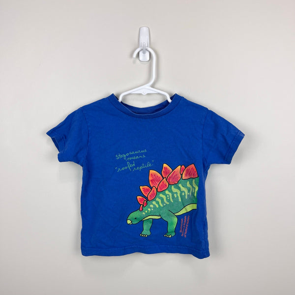 Vintage Smithsonian Institution National Museum of Natural History Blue Stegosaurus Tee Shirt. Toddler boy or girl size 4T. Casual short sleeve top featuring a dinosaur and the fun fact, "stegosaurus means roofed reptile."