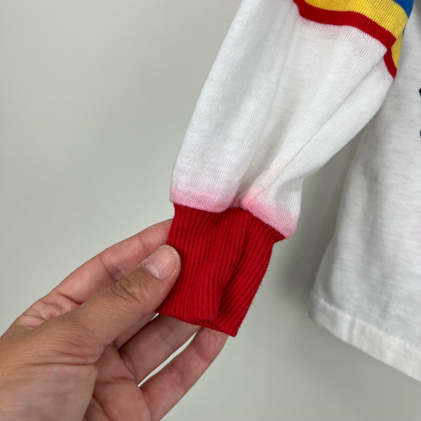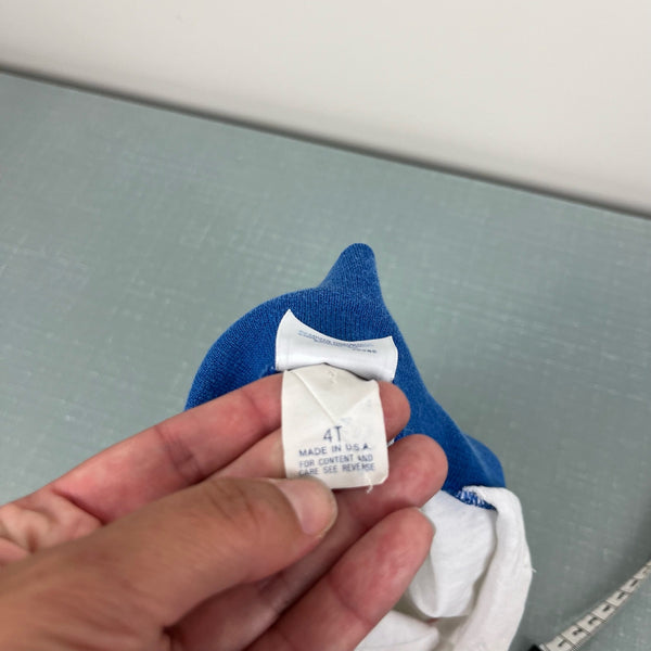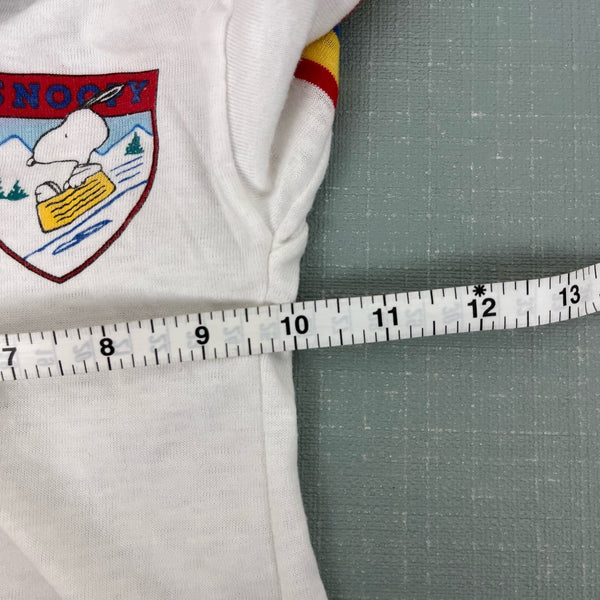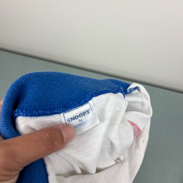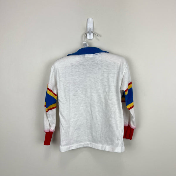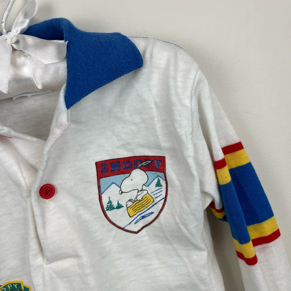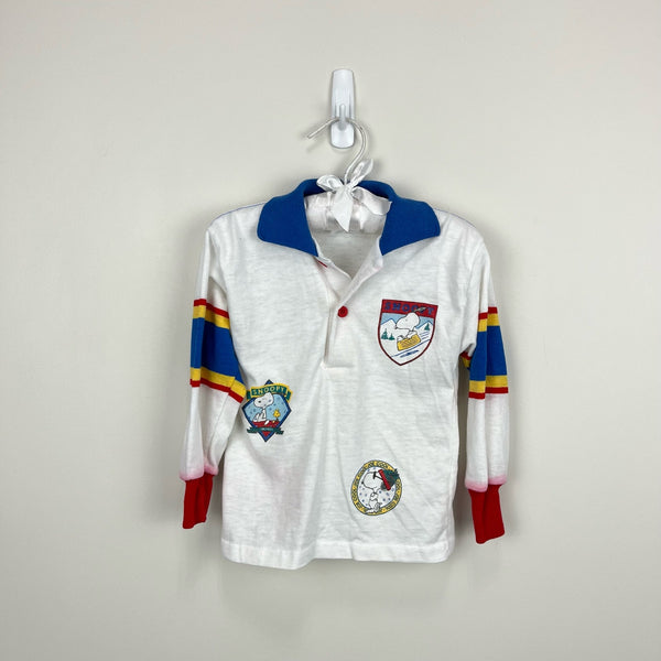 Vintage Snoopy by Buster Brown Sledding Polo Shirt. Toddler boy size 4T. USA made. Long sleeve top with blue collar, red cuffs, and stripes on the sleeves. Fun design featuring Snoopy playing in the snow! Has a couple spots of color bleed (see last two photos). Perfect for winter paired with jeans!