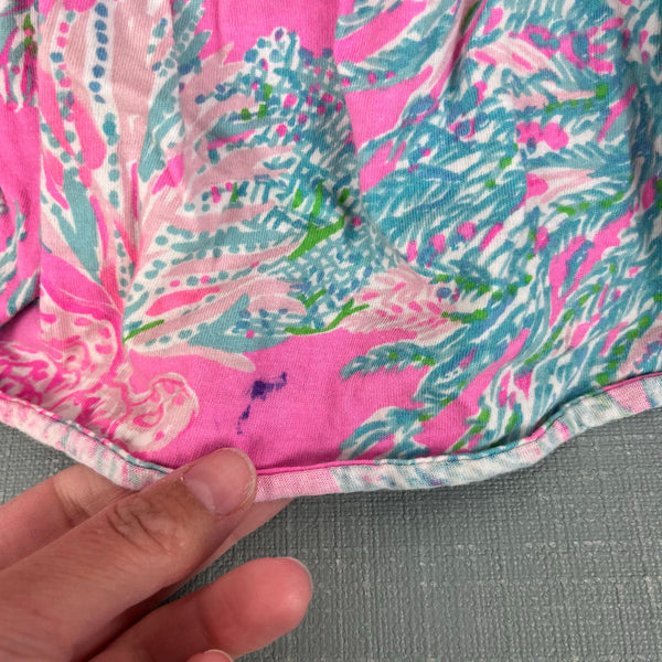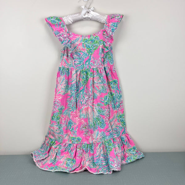 Lilly Pulitzer Girls Vienna Maxi Dress Prosecco Pink Seaing Things. Toddler girl size small (4-5 years). Sleeveless dress with ruffles on the shoulders. Pink, blue, and green print. Just noticed a mark at the hem (see last photo; untreated), but otherwise great condition with light wear. Retail $88.