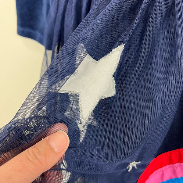 Mini Boden Velvet Bodice Tulle Dress College Navy Rainbow. Toddler girl size 3-4 years. Navy blue velour 3/4 sleeve top and layered tulle skirt bottom with applique stars and rainbow. I found one small hole in the tulle (see last photo), but it's not at all noticeable unless you're inspecting! Perfect for a party!