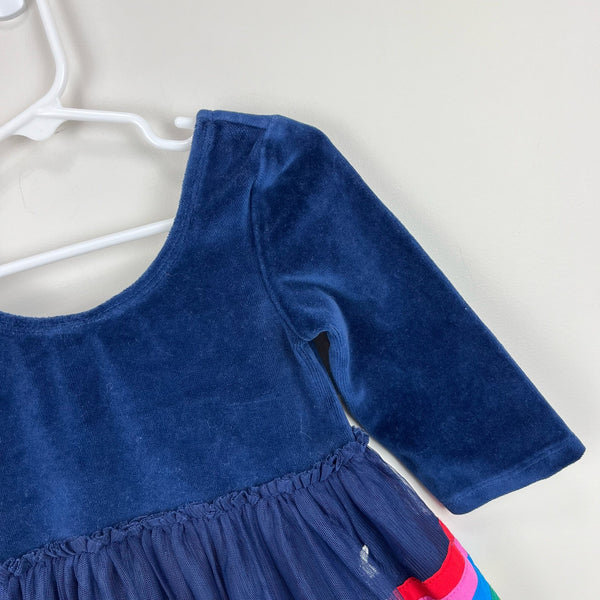 Mini Boden Velvet Bodice Tulle Dress College Navy Rainbow. Toddler girl size 3-4 years. Navy blue velour 3/4 sleeve top and layered tulle skirt bottom with applique stars and rainbow. I found one small hole in the tulle (see last photo), but it's not at all noticeable unless you're inspecting! Perfect for a party!