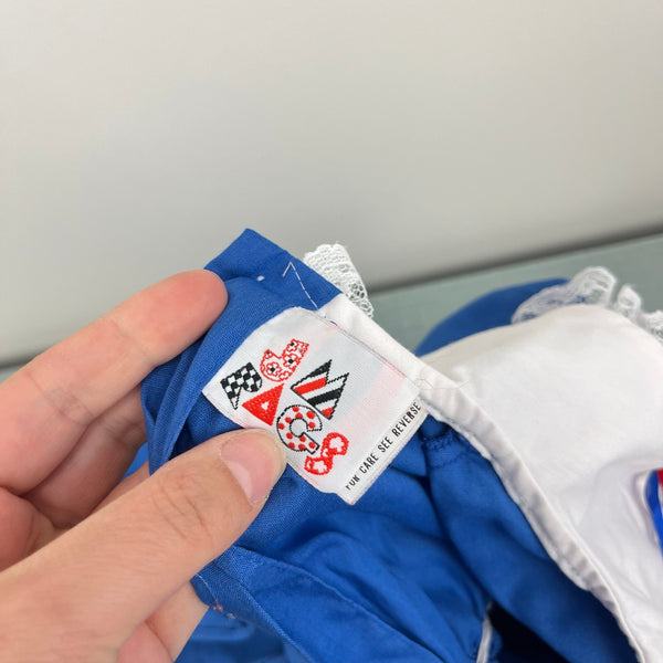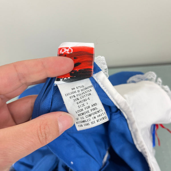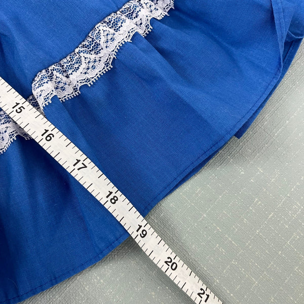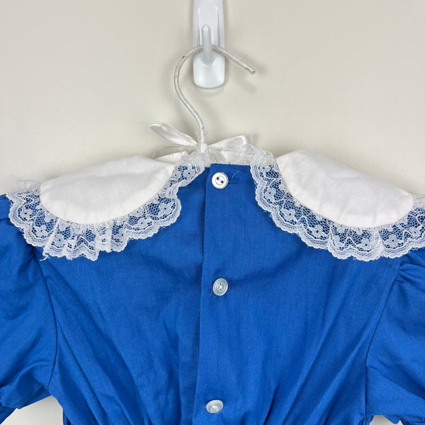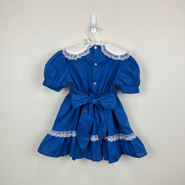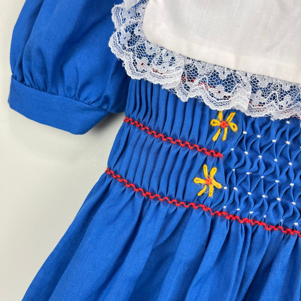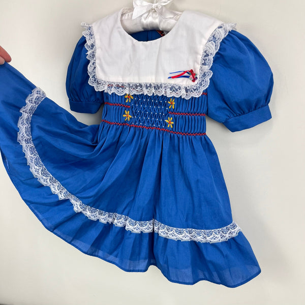 Vintage JM Rags Blue Smocked Ruffle Lace Party Dress. Toddler girl size 4T. Short sleeve blue dress with oversized white bib collar lined in lace. Gorgeous smocking with colorful embroidered flowers across the chest. Elastic in the the waist for a perfect fit. Buttons closure and a sash to tie a nice big bow! Full circle skirt is perfect for twirling! Great conditipn with no flaws noted.