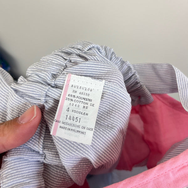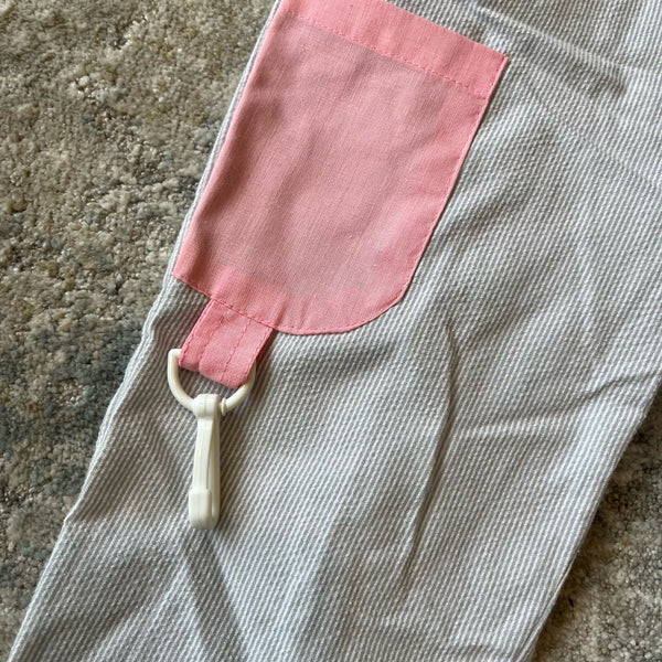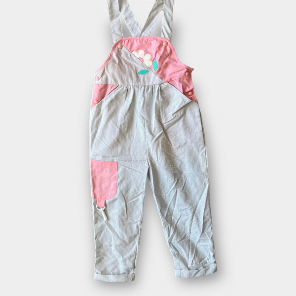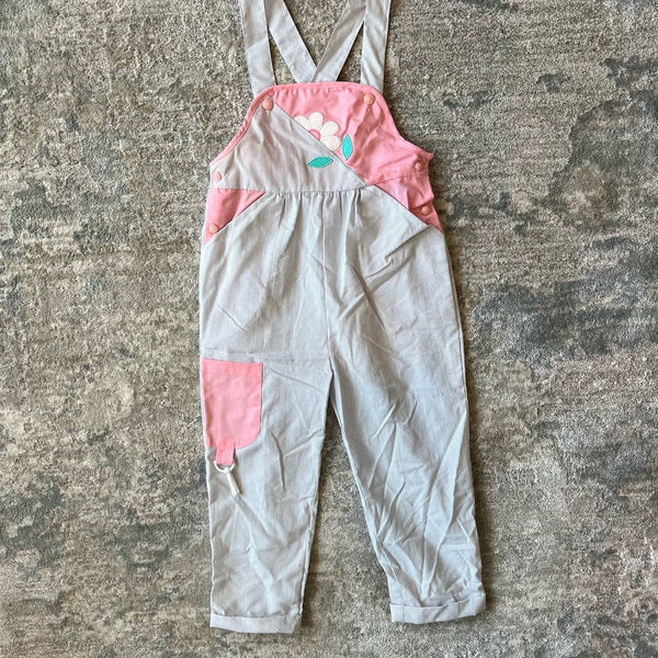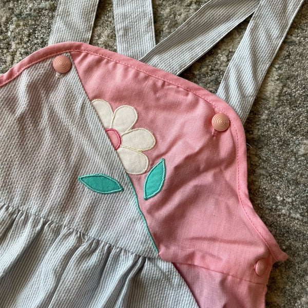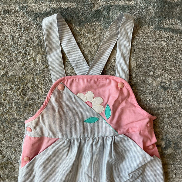 Vintage Pink Gray Flower Overalls. Toddler girl size 4T. Pictures don't do these justice! Lightweight gray and white striped overalls with pink flower applique bib. Elastic in the back. Excellent condition!