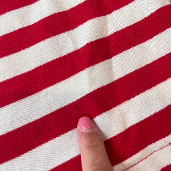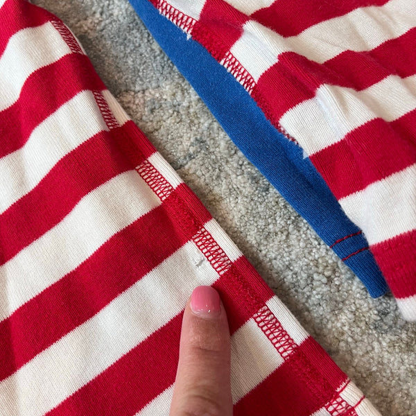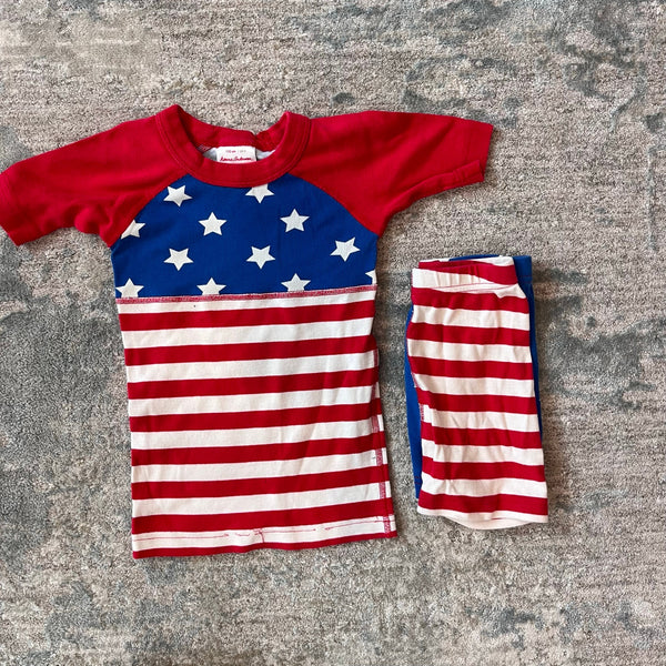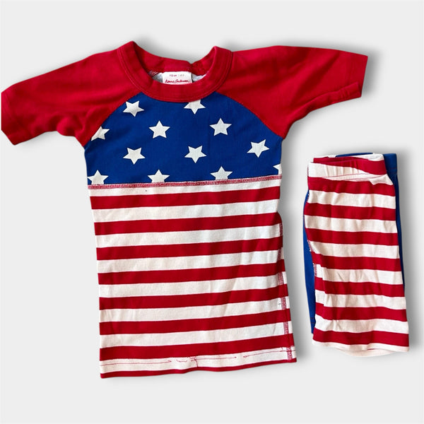 Hanna Andersson S'mores Short John PJs. Toddler boy or girl size 110 cm (US 5T). Two piece pajama set in patriotic red, white, and blue stars and stripes. Has loose threads at the hem a couple small tears, and a tiny spot (see photos). Still functional and super cute for summer!