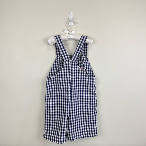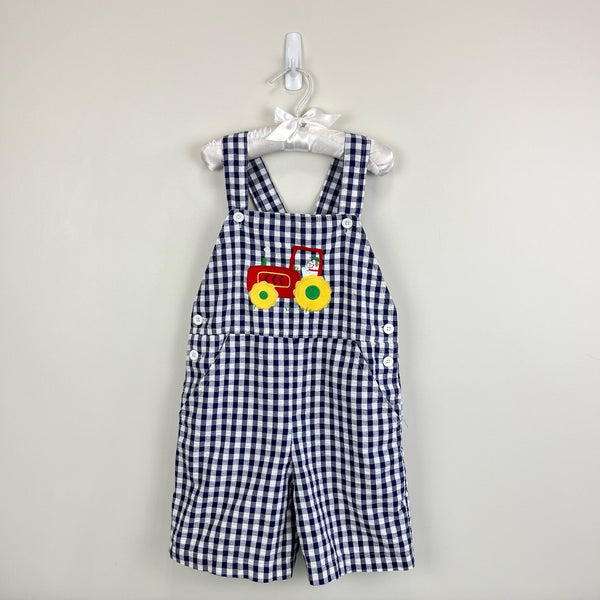 Vintage Kelly's Kids Plaid Puppy Tractor Shortall. Boys size 5-6 years. Navy blue and white gingham plaid overall shorts with applique red tractor driven by a dog! So cute for spring and summer!