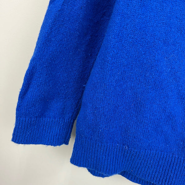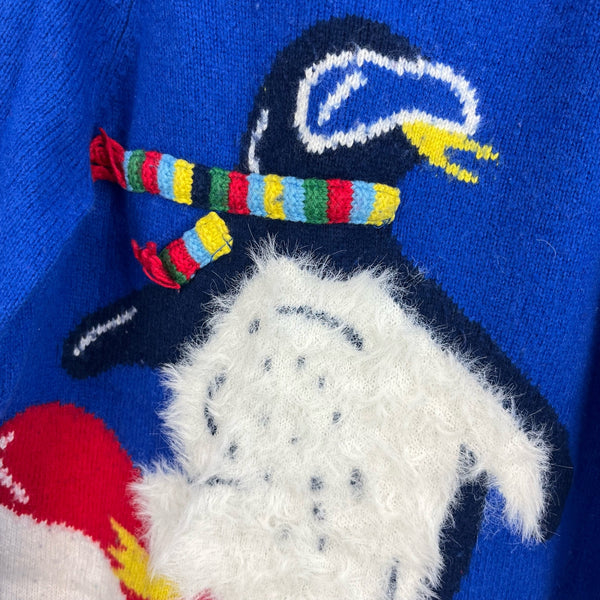 Mini Boden Fuzzy Blue Snowboarding Penguin Sweater. Boys size 5-6 years. Cozy crewneck sweater in royal blue. Fun knit pengiun on a snowboard, wearing a rainbow striped scarf and ski goggles. Soft, fluffy white belly! Typical sweater wear, including some other colored fuzz caught in the white snow (see photos).
