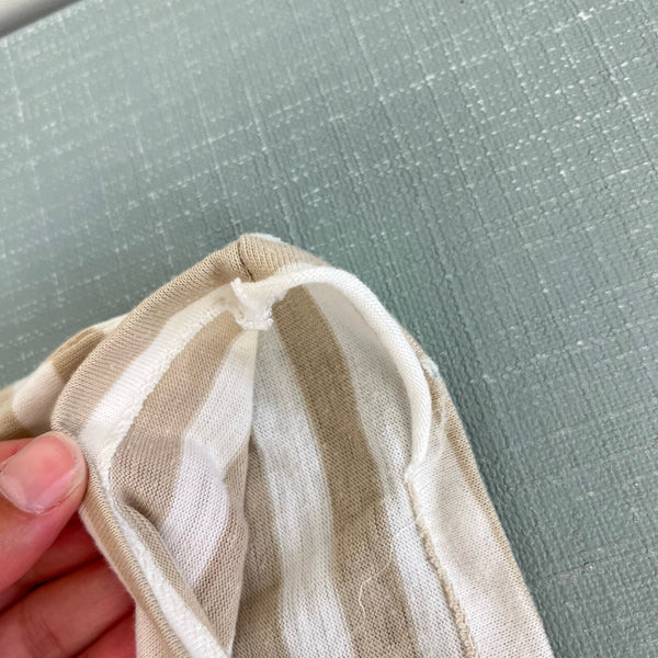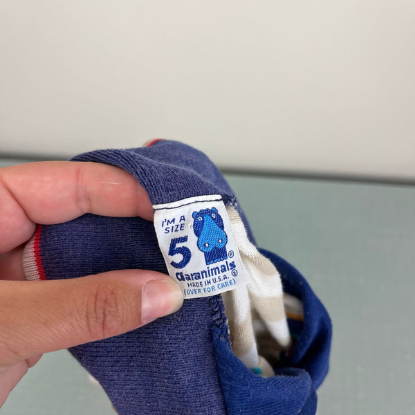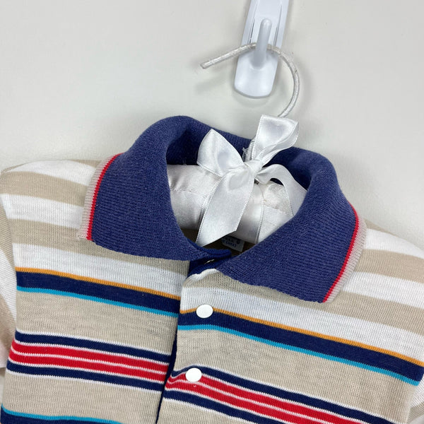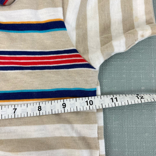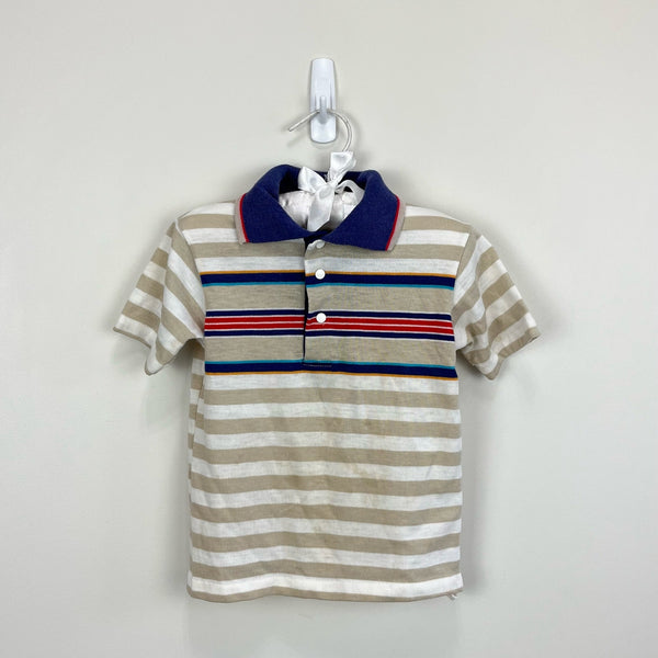 Vintage Garanimals Striped Polo Shirt. Toddler boy size 5T. USA made. Short sleeve collared top in mixed white, tan, navy blue, and red stripes. Has some light marks, a small spot of undone stitching at the hem, and a couple tears on the sleeve. Still super cute for every day play!
