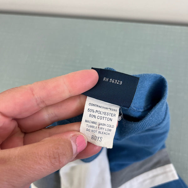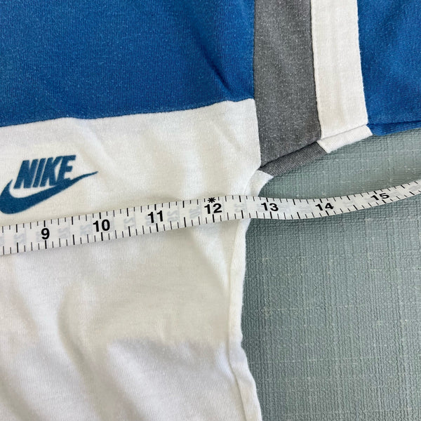 Vintage Nike White Blue T-Shirt. Size small; see photos for measurements. USA made. Soft and cozy baseball style top. Tiny spot on the back (see last photo; untreated), but otherwise great condition!