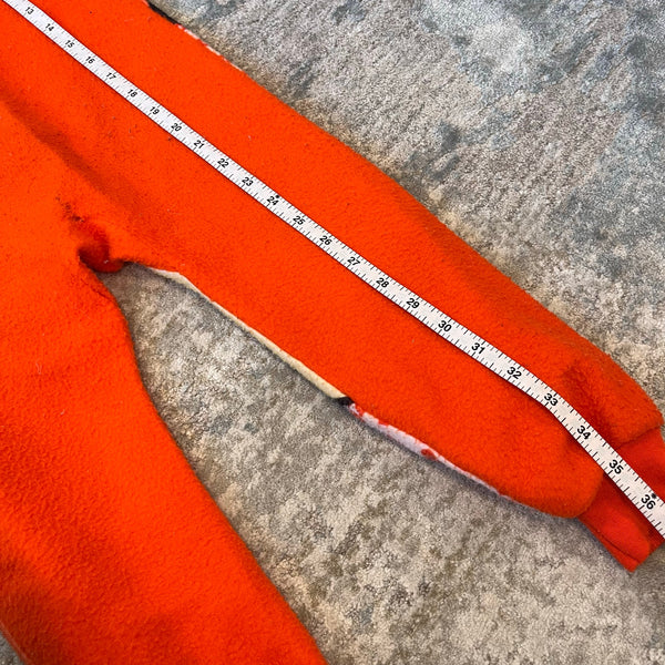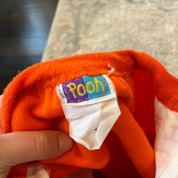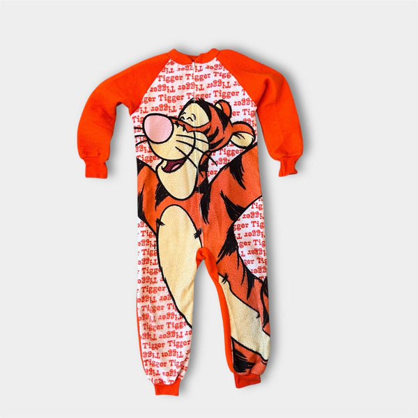 Vintage Winnie the Pooh Tigger Fleece Toddler Pajamas. Size tag faded, but based on when I bought these for my kiddo, I'd guess a boy or girl 5T. Please double check measurements to ensure fit. Cozy one piece footless PJs. Orange with full size Tigger on the front. I'm almost certain we purchased dead stock (NWT) and my kiddo loved and wore for two winters, squeezing into these when he probably shouldn't have! They have visible fleece wear, a mark on the cuff, and a little tearing at the crotch (see last 2 photos).