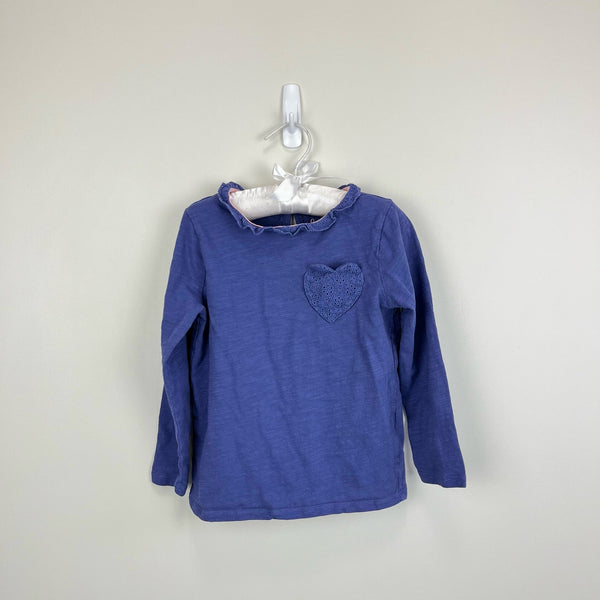 Mini Boden Long Sleeve Heart Pocket T-Shirt Soft Starboard Blue. Girls size 5-6 years. Cozy cotton long sleeve tee with eyelet ruffle along the neck and heart patch pocket on the chest. Pin holes by the keyhole button back (see photo), but otherwise great condition.