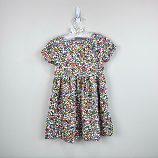 Mini Boden Short Sleeve Fun Floral Jersey Dress. Toddler girl size 4-5 years. Casual short sleeve play dress in colorful flower pattern. Colors are perfect for fall! Has pockets!