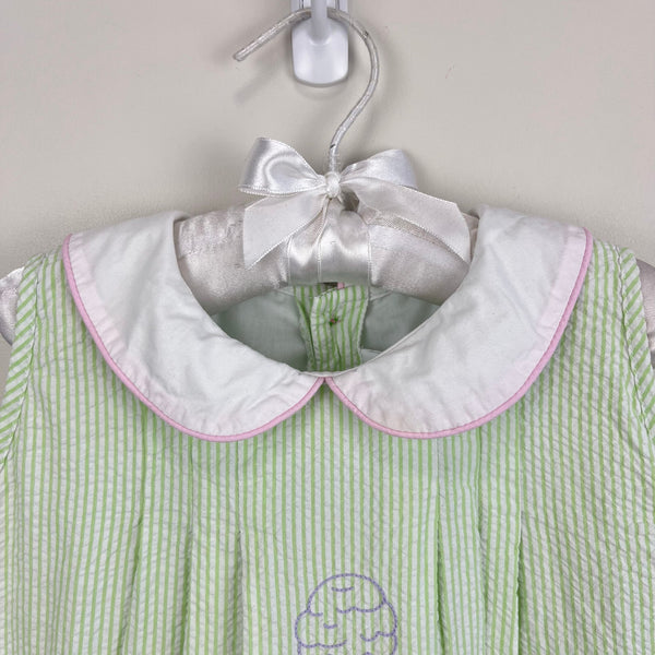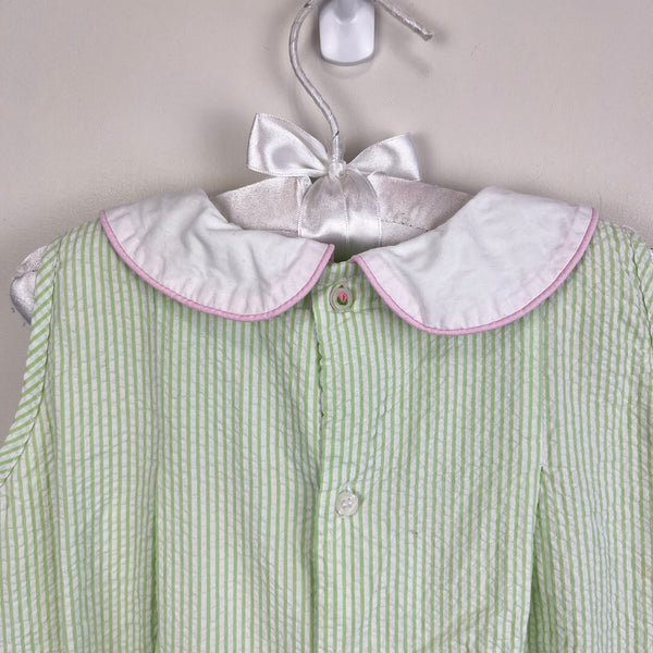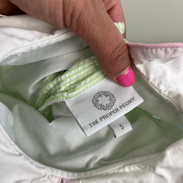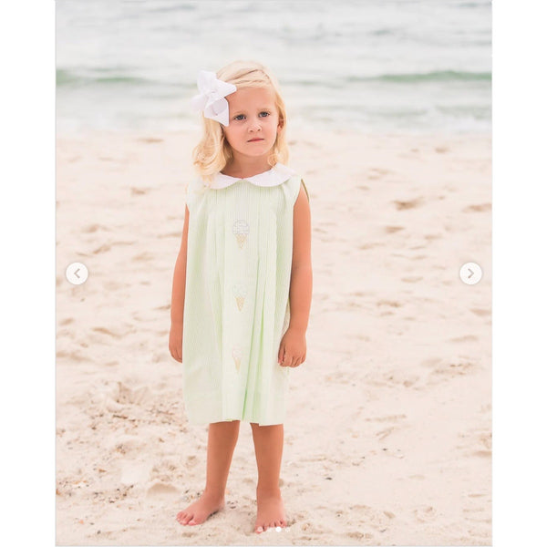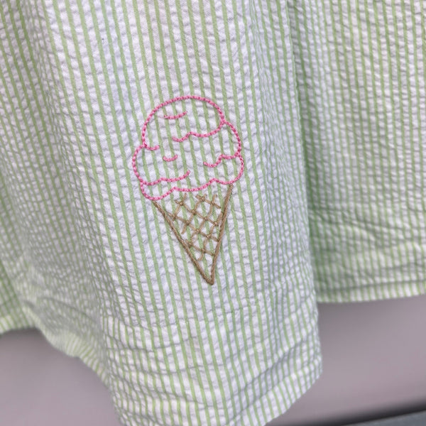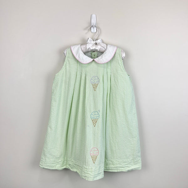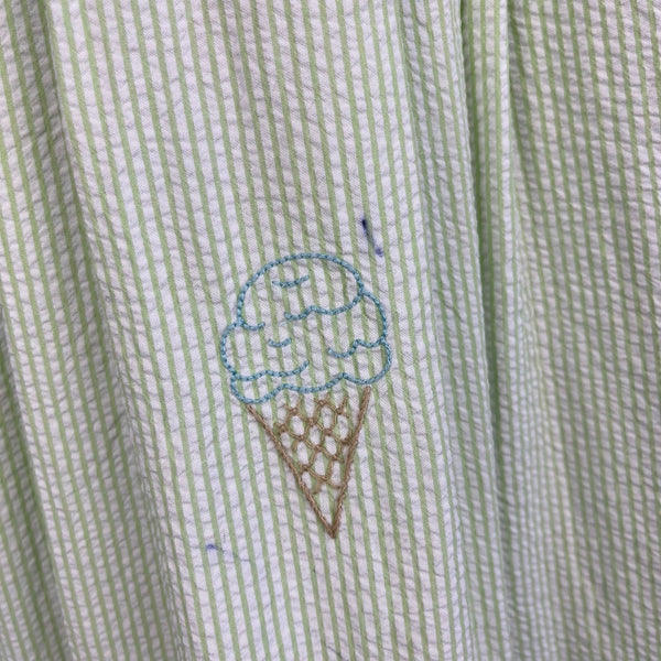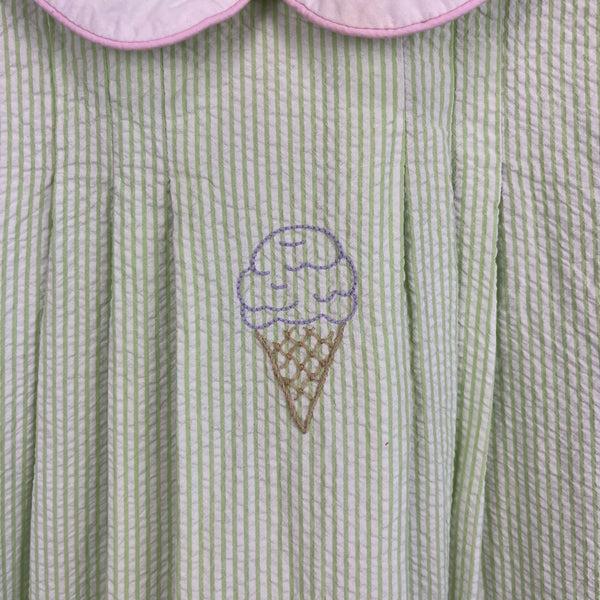 The Proper Peony Green Seersucker Hand Embroidered Sweet Scoops Dress. Toddler girl size 5T. Sleeveless green and white striped dress features white peter pan collar with pink piping, pleats, and embroidered pastel ice cream cones. Fully lined. Button back. Has marks near the blue cone (see photo; untreated). So cute for a summer party!