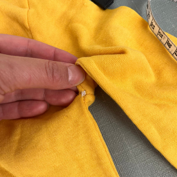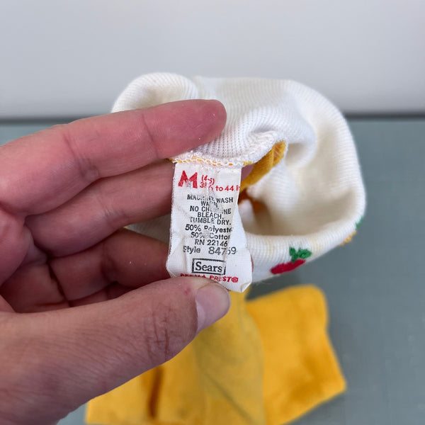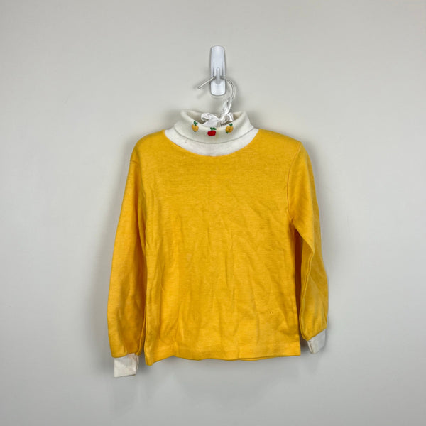 Vintage Sears Yellow Fruit Turtleneck. Toddler girl size M (4-5 years). Long sleeve yellow top with white cuffs and collar. Adorable apple and pear design at the neck. Has some wear (untreated marks, wonky stitching in the armpit, and a pulled thread at the neck; see photos). So cute paired with overalls or a cardigan!