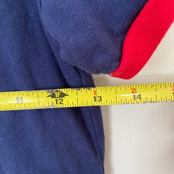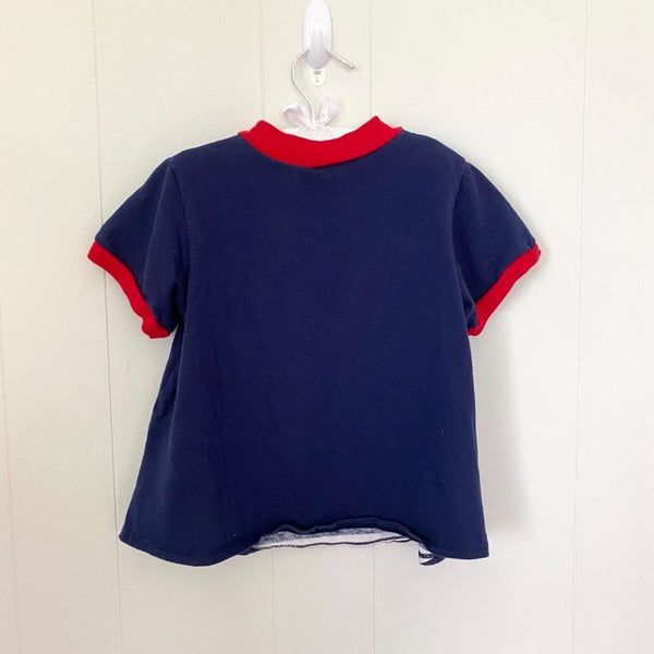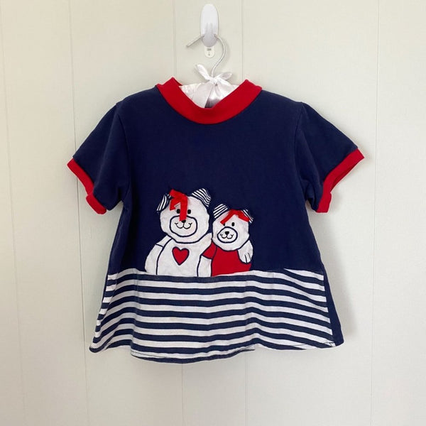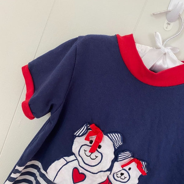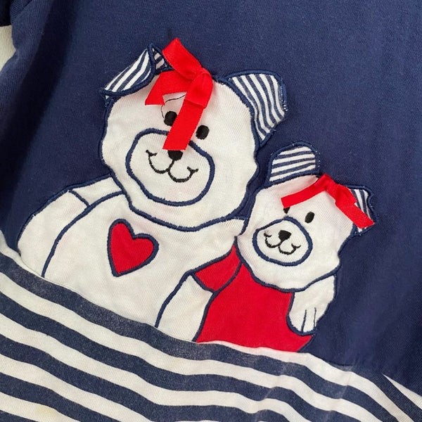 Vintage Young Hearts Nautical Bear Tee. Toddler girl size 5T. Short sleeve t-shirt top. Navy blue and red with stripes across the bottom. Has two cute teddy bears with real ribbon bows. Has a pin hole in the back (see last photo).