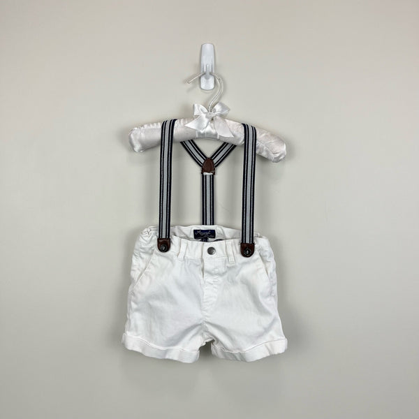 Mayoral Baby White Suspender Shorts. Baby boy size 9 months. Dressy white shorts with adjustable waistband and elasticized suspenders. So cute for a special occasion this summer!