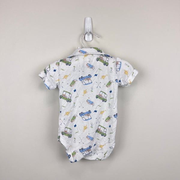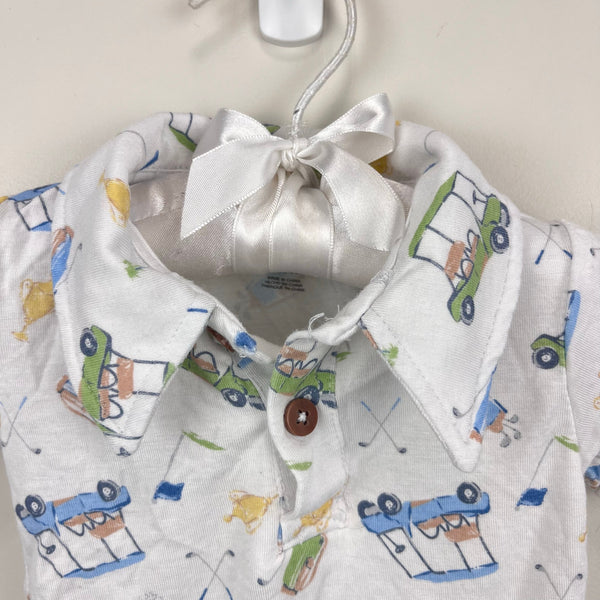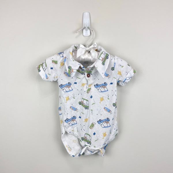 Milkberry Bamboo Golf Polo Bodysuit. Baby boy size 6-9 months. Short sleeve collared onesie in super soft bamboo. White with fun golf themed print - golf carts, flags, clubs, and more!