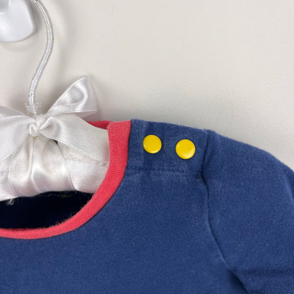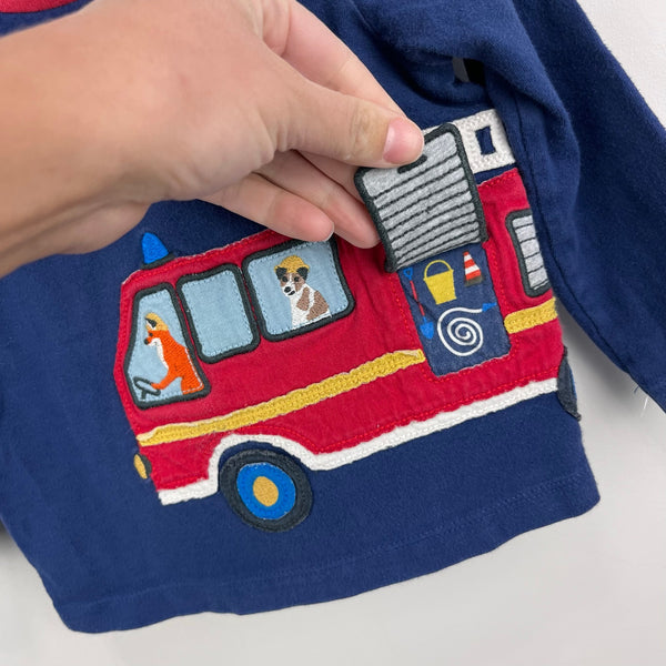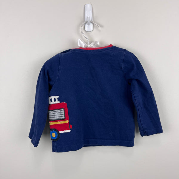 Mini Baby Boden Fire Truck Appliqué Tee Shirt Beacon Blue Fire Engine. Baby boy size 6-12 months. Casual long sleeve navy blue top with wrap around red fire truck driven by dogs! Lift the flap to reveal their tools! Snaps on the shoulder for easy on/off. Light wear/navy fade; no stains, tears, etc. Twin match available separately!