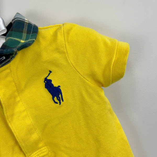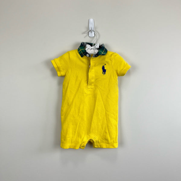 Ralph Lauren Yellow Striped Polo Shortall Romper. Baby boy size 9 months. Cute and simple one piece coverall outfit for summer! Bright yellow with green plaid collar. Snaps at the crotch for easy diaper changes. Big embroidered polo pony on chest. Minuscule pinhole at snaps, but otherwise great condition!