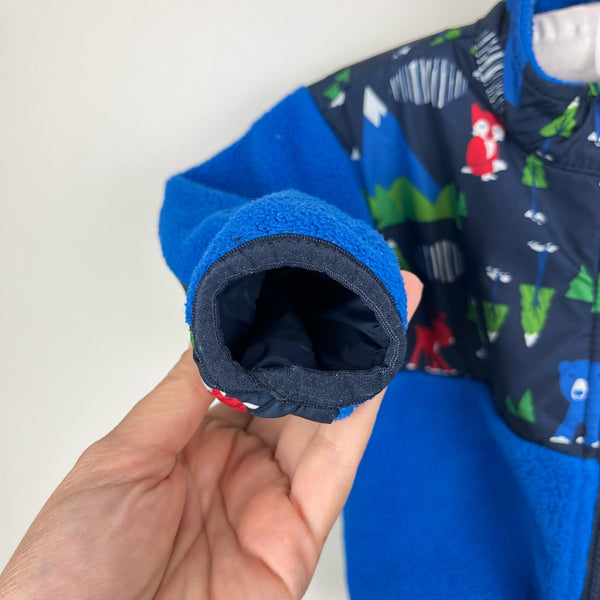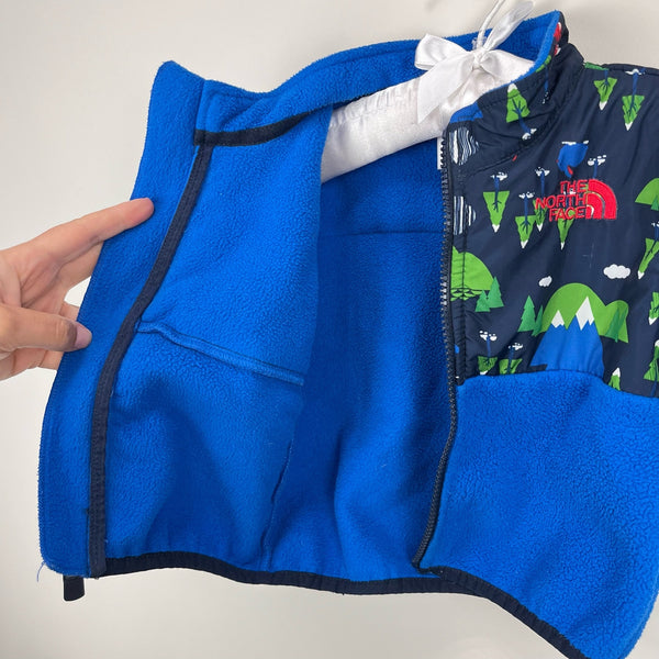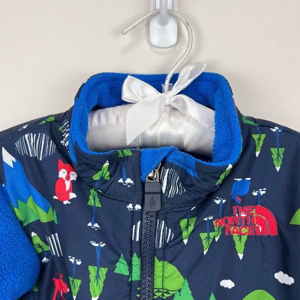 The North Face Blue Woodland Denali Fleece Jacket. Baby boy size 6-12 months. Full zip bright blue fleece coat. Fun navy print with mountains, trees, and forest animals. Light wear. Great for fall and spring, or even layering on milder winter days.