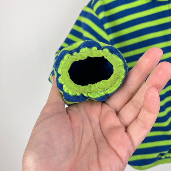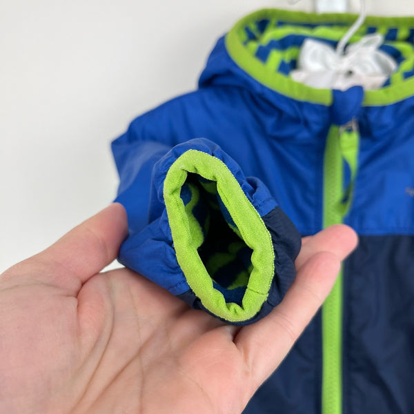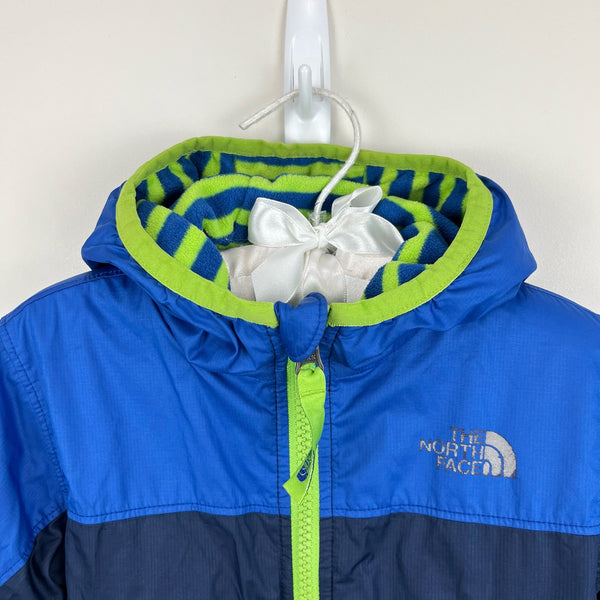 The North Face Reversible Scout Wind Jacket Blue Green. Baby boy size 6-12 months. Durable 50 denier polyester color block blue and navy shell on one side and soft green and blue striped fleece on the other. Features elastic-bound hem, cuff and fixed hood, chin guard, welt hand pockets, and reflective logo at the chest. Great condition with one small flaw (see last photo).