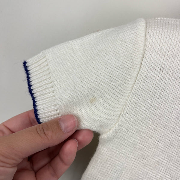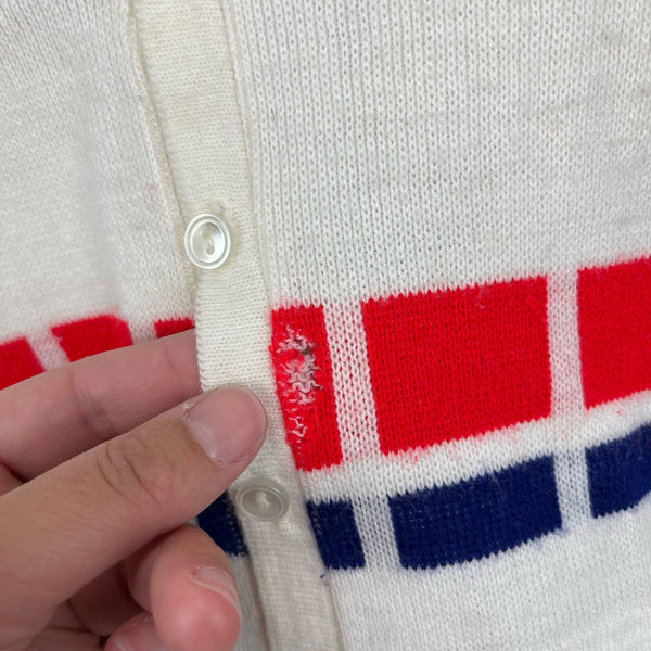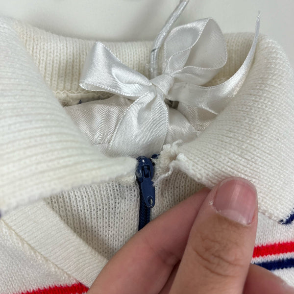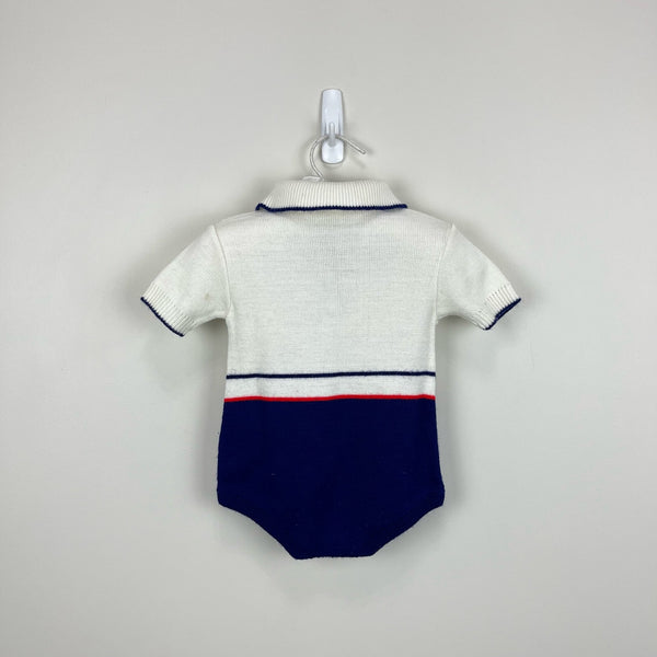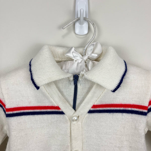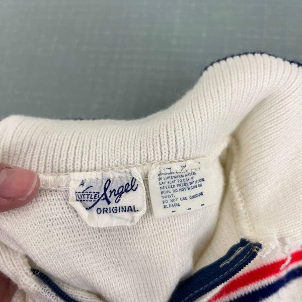Vintage 70s A Little Angel Knit Sweater Romper Set. No size on tag, so please check measurements to ensure fit. (I'd guess a baby boy size 9 months or so.) Two piece outfit includes short sleeve collared shortall and matching cardigan sweater. White with navy blue and red. Zipper front and snaps at the bottom. Has a small mark and two spots of wear (see photos).