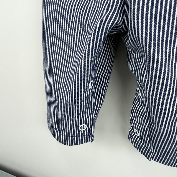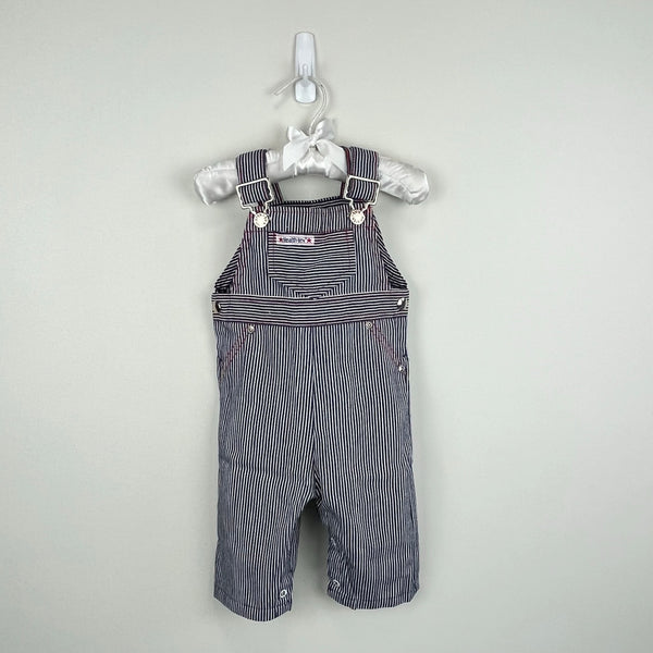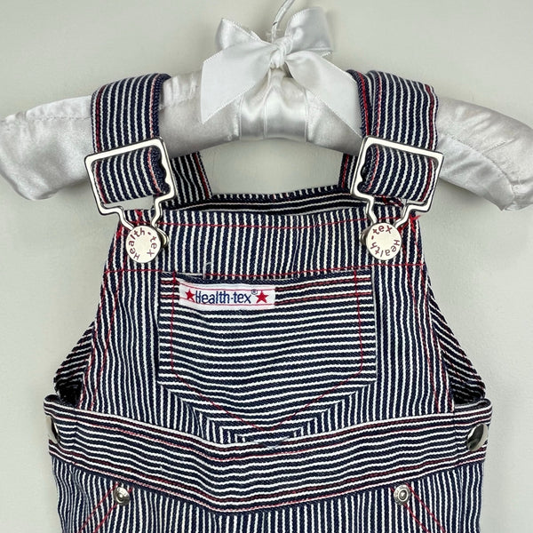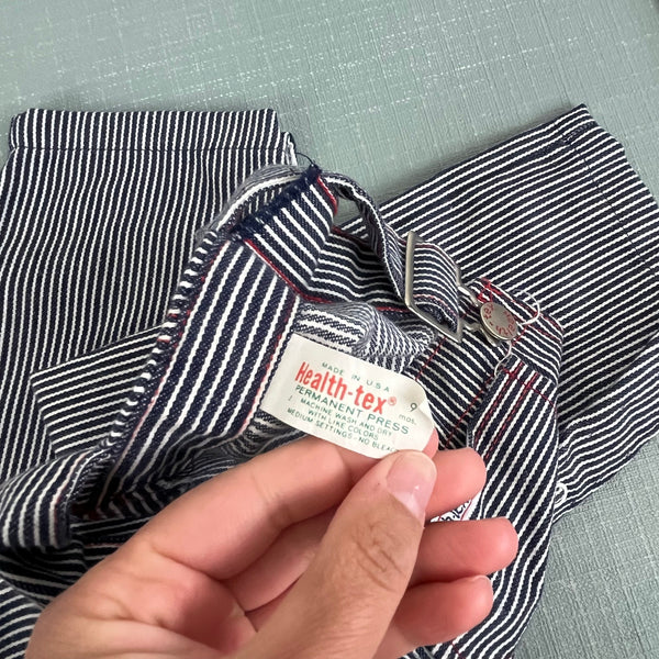 Vintage Health-tex Striped Overalls. Baby boy size 9 months. USA made. Classic navy blue and white engineer stripes with fun red stitching. Adjustable shoulder straps and snaps along the legs. Healthex star patch on the bib pocket. Great condition!