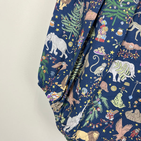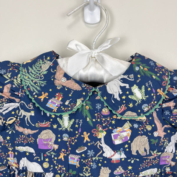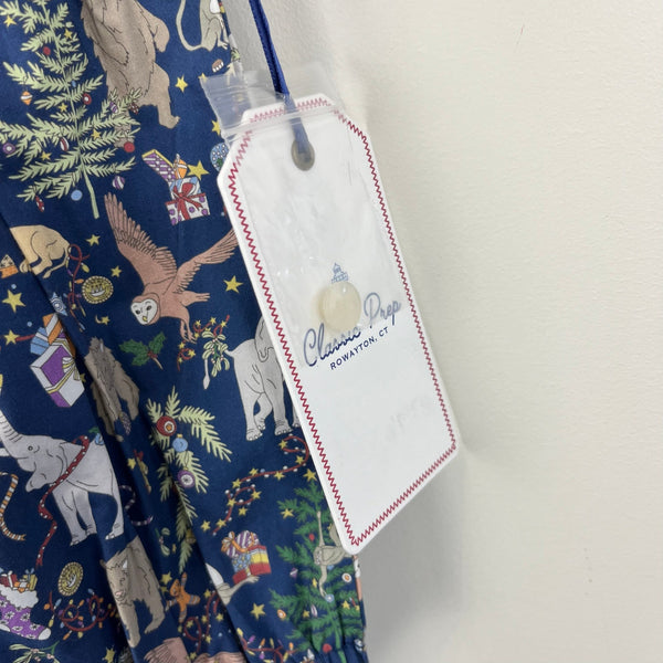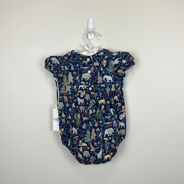 CPC Juniper Bubble Liberty Christmas Print. Baby girl size 6-9 months. Brand new with tag (NWT). Original retail $89. Stunning deep navy blue one piece romper outfit with festive print of elephants, presents, Christmas trees, monkeys, and more! Peter pan collar and shirred cap sleeve. Buttons in the back and snaps at the bottom for easy on/off.