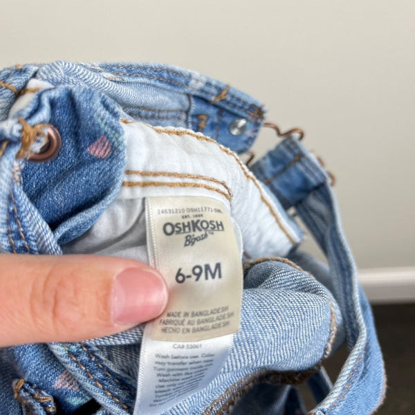 OshKosh B'gosh Blue Floral Overalls. Baby girl size 6-9 months. Classic blue jean overalls with pretty pastel flower print. Classic vestbak style with adjustable straps. Great condition with no flaws to note! Matching jumper available for big sister!