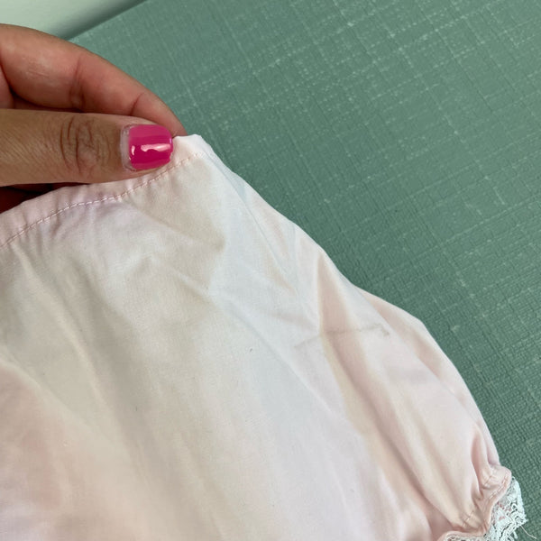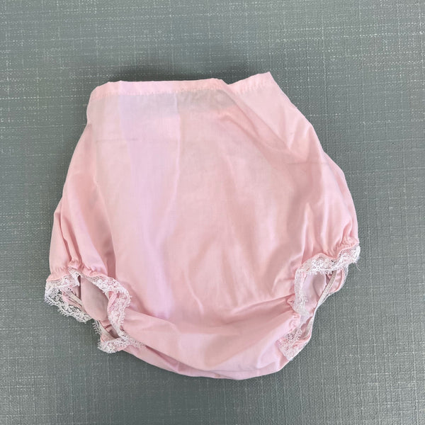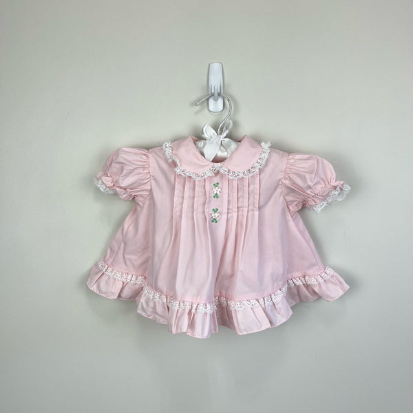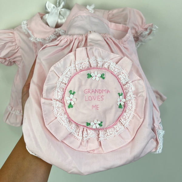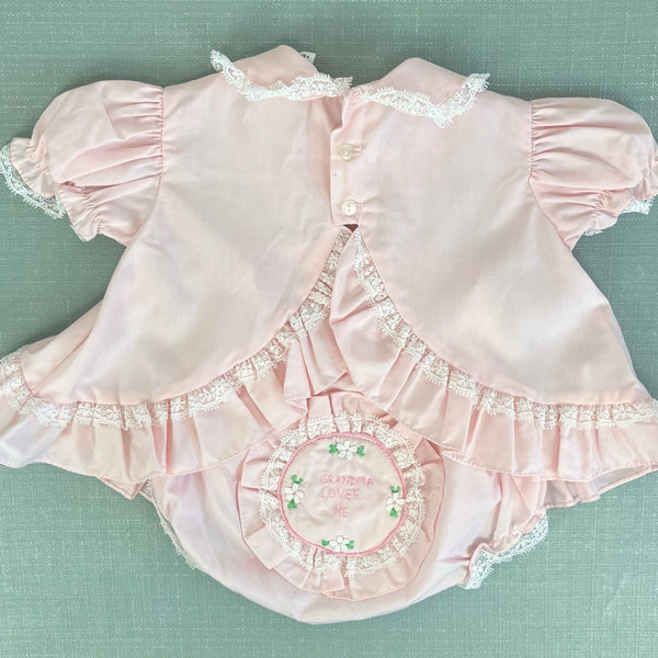 Vintage Nannette Grandma Loves Me Pink Dress Set. Baby girl size 9 months. It doesn't get any sweater than this! Pink collared dress with puff sleeves, embroidered flowers, pin tuck pleats, ruffle hem, and lace detail. Open button back to exposure bloomers. Light mark on diaper cover (see photo; untreated) but otherwise great condition!