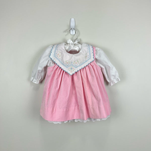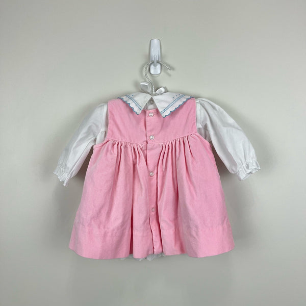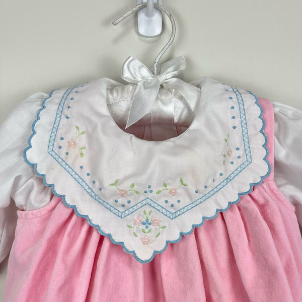 Vintage Pink White Collared Dress. Baby girl size 9 months. Layered set with pink velvet pinafore and long sleeve white blouse dress. Eyelet ruffle hem and beautiful embroidery on blue scallop lined bib collar. Great condition with no flaws noted!