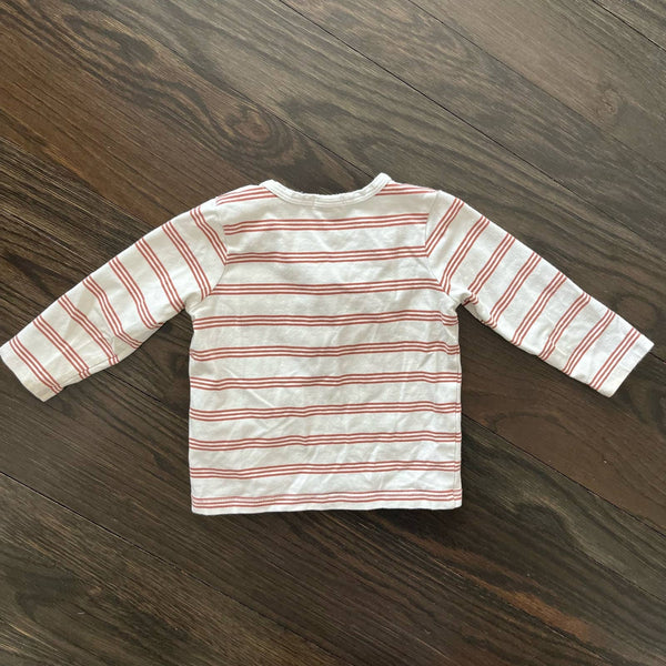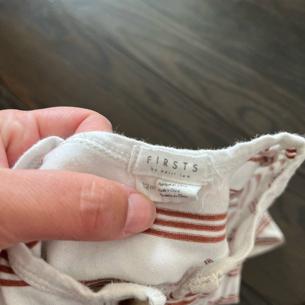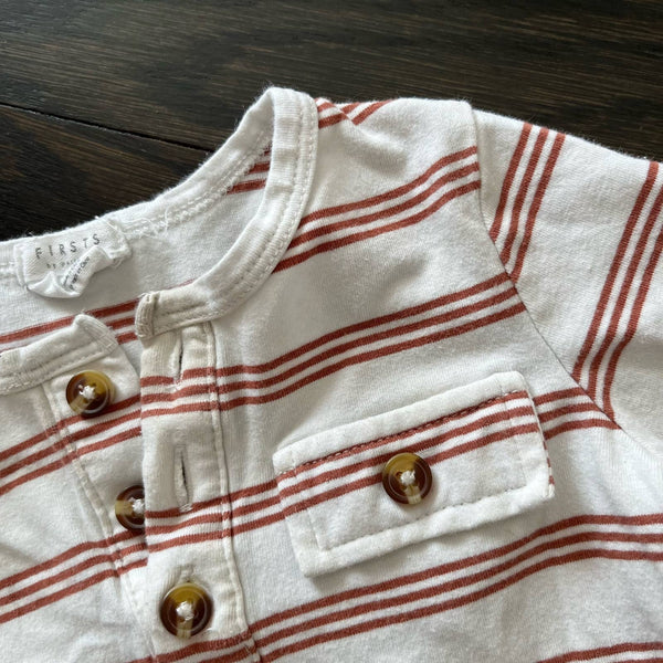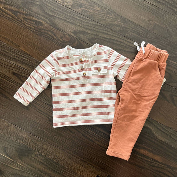 First by Petit Lem Striped Shirt & Pants Set. Baby boy size 12 months. Cozy long sleeve henley top. White with burnt orange stripes. Matching pull on pants. Orange color was hard to capture; most accurate in photos on couch. Perfect for fall!