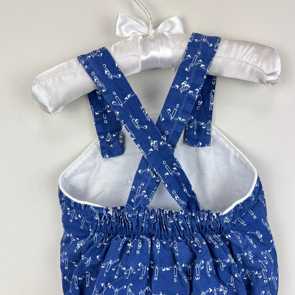Kayce Hughes Blue Alphabet Sun Suit Bubble Romper. Baby boy or girl size 12 months. Adorable one piece shortall outfit. Fully lined with elastic in the back. Adjustable button straps and snaps on the bottom. Has marks on the inside lining (see photos; untreated). So sweet for summer!