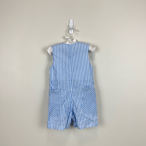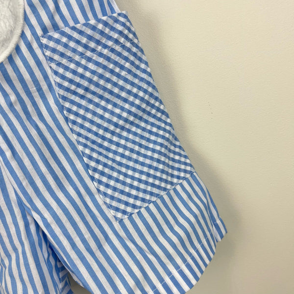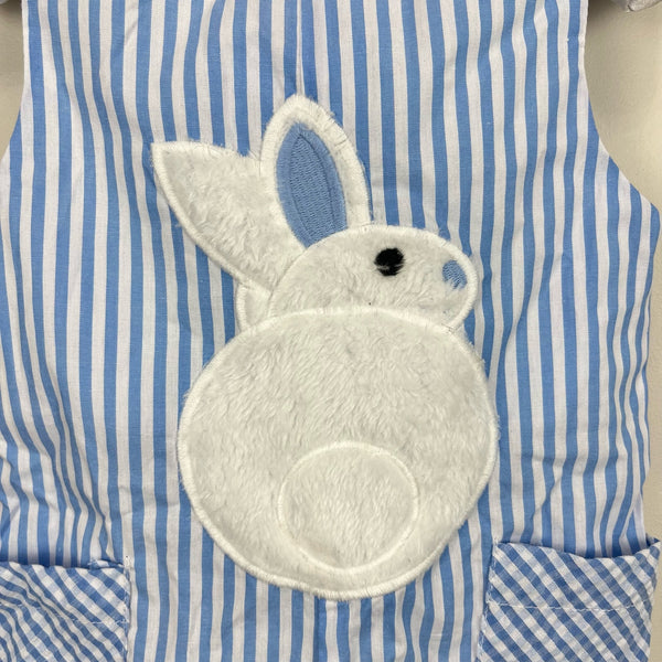Lil Cactus Blue Bunny Shortall Romper. Baby boy size 6-12 months. Dressy jon jon overalls style one piece outfit. Adjustable buttons on the shoulder. Blue and white stripes with plaid pockets and a fuzzy bunny rabbit on the belly. Great condition! Perfect for Easter!