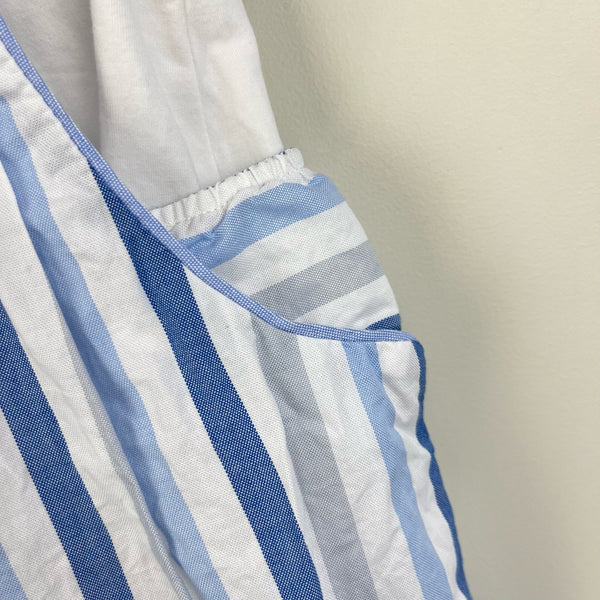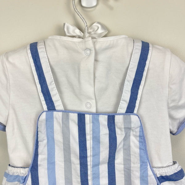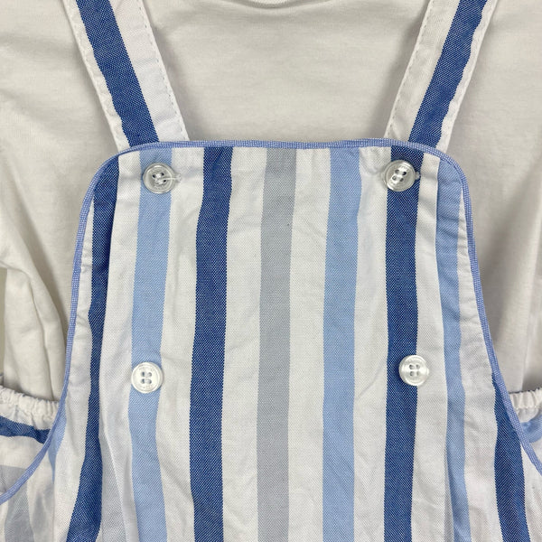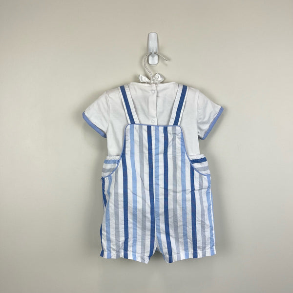 Mayoral Baby Blue Striped Shortall Romper Set. Baby boy size 12 months. One of my favorite brands for baby boy clothes! Gorgeous one piece sun suit overalls outfit for summer. Mixed blue, white, and gray stripes. Includes matching short sleeve white top. (Just as cute worn without the shirt on a hot summer day!) Excellent condition.