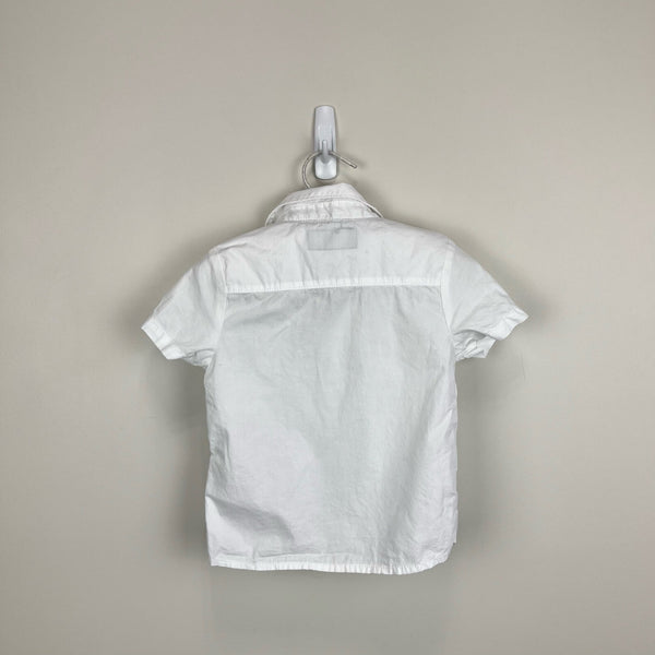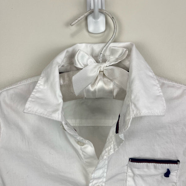 Mayoral Short Sleeve White Button Up Shirt. Baby boy size 80 cm (US 12 months). Crisp white collared dress shirt with navy lined pocket. Excellent condition.