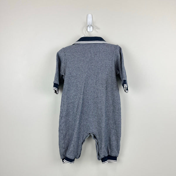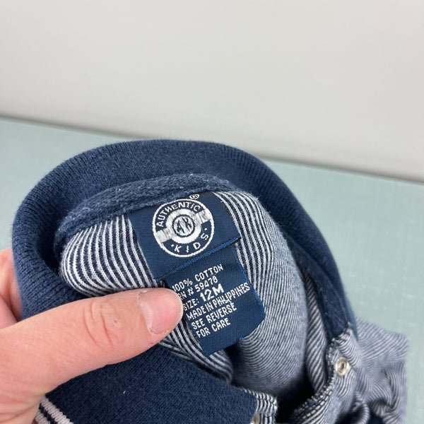 Vintage 90s Authentic Kids Dinosaur Coverall. Baby boy size 12 months. Cozy one peice collared jumpsuit outfit. Thin navy blue and white stripes with a red dinosaur patch on the pocket. Snaps down the front and along the legs.
