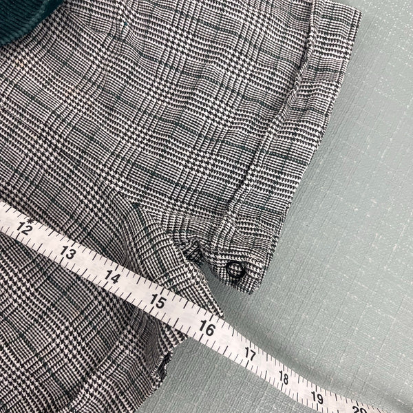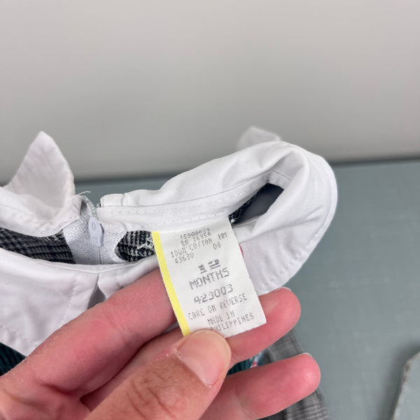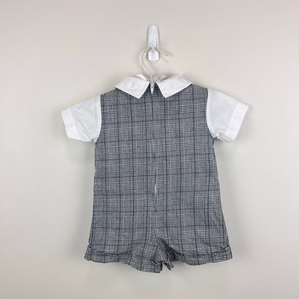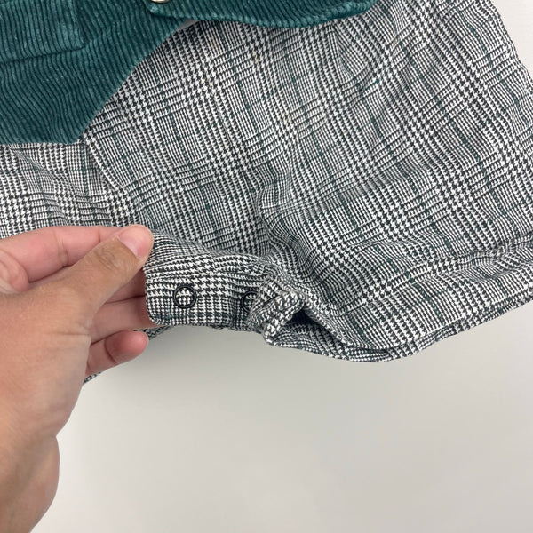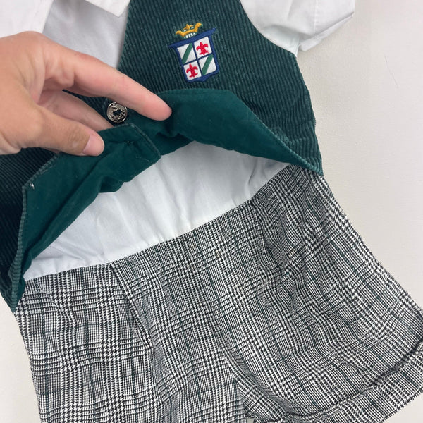 Vintage Boys Vest Set Suit Romper. Baby boy size 12 months. Adorable one piece dressy outfit designed to look like three piece shorts, short sleeve collared shirt, and green corduroy vest. Snaps at the bottom and zipper in the back. Great condition with no flaws noted! Perfect for Christmas or a party!