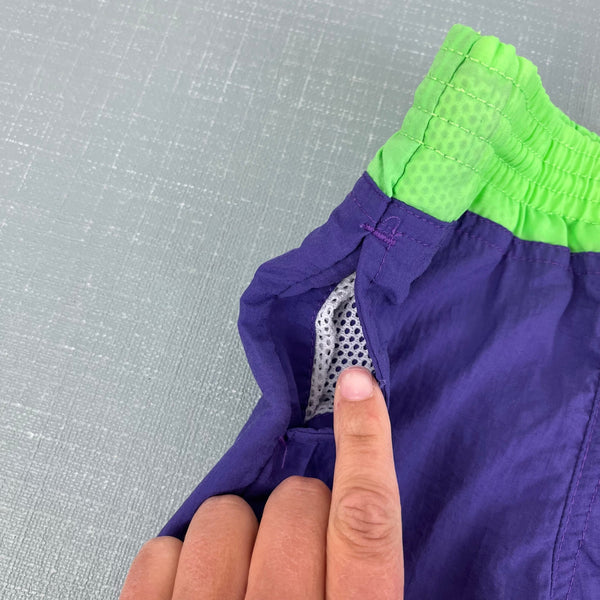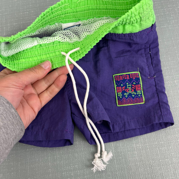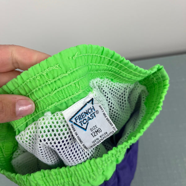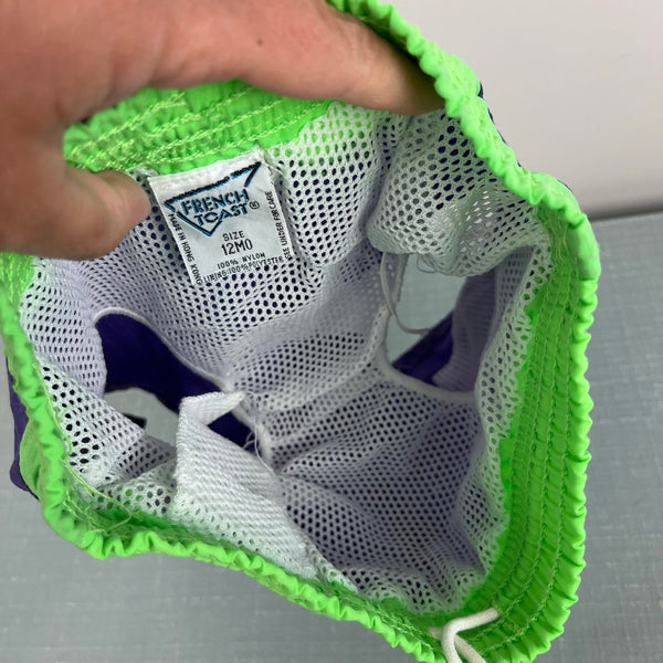 Vintage French Toast Surfer Dude Swim Trunks. Baby boy size 12 months. Purple and neon green bathing suit shorts with surf patch on the leg. Elastic is worn out, but has a functional drawstring waist.