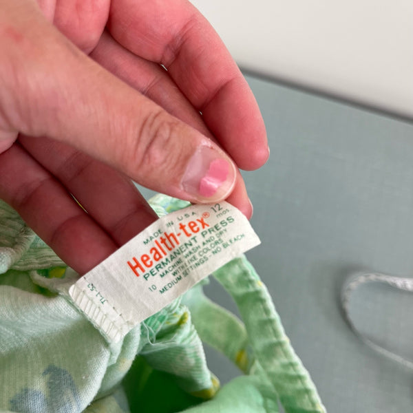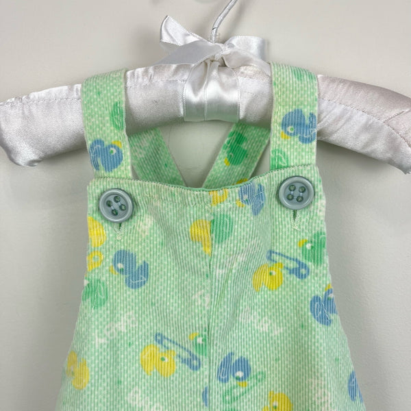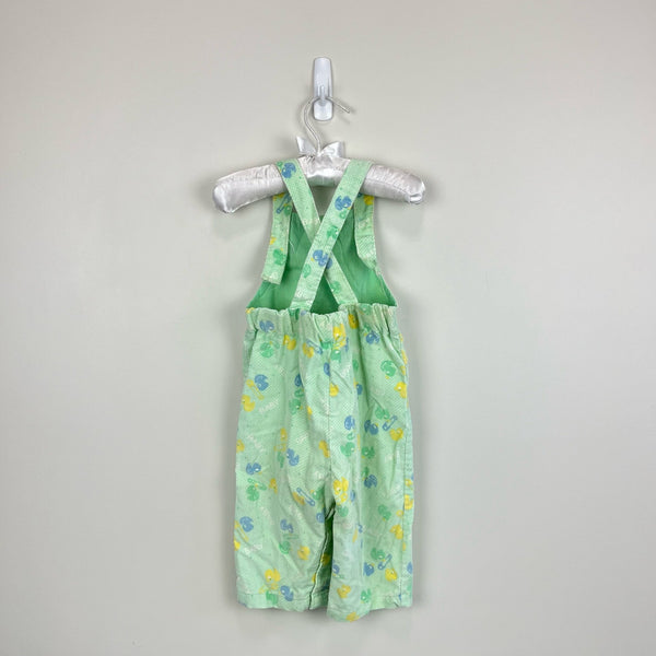 Vintage Health-tex Green Ducky Overalls. Baby boy size 12 months. USA made. Cozy pastel green corduroy overalls with blue and yellow safety pin and rubber duck print. Button straps and snaps along the legs. Elastic in back doesn't function anymore but no other flaws noted!