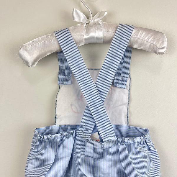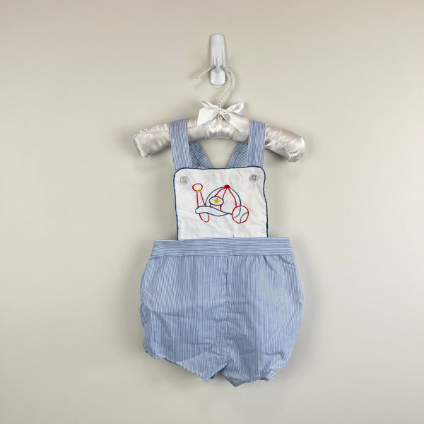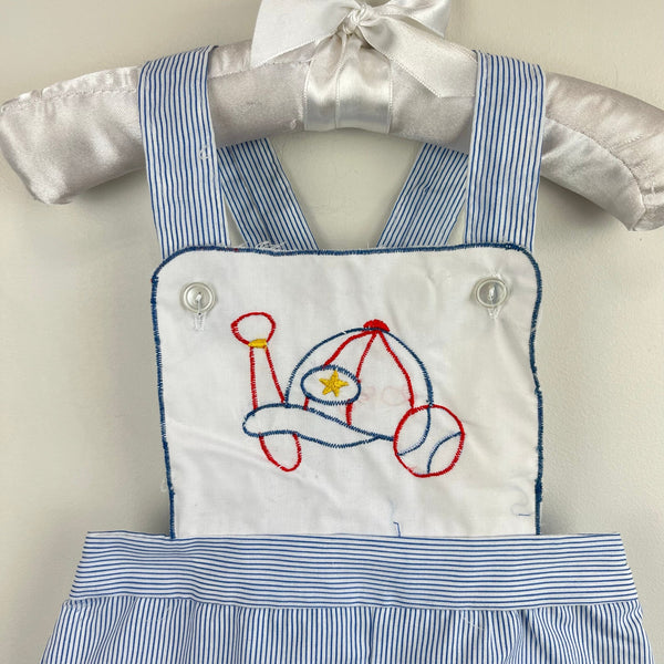 Vintage Judy Philippine Blue Baseball Sun Suit Romper. Baby boy size 12 months. One piece shortall outfit. Blue and white stripes with embroidered bat, ball, and cap on the bib. Button straps and elasticized waist. Seems unworn, new without tags (NWOT). Perfect for summer!