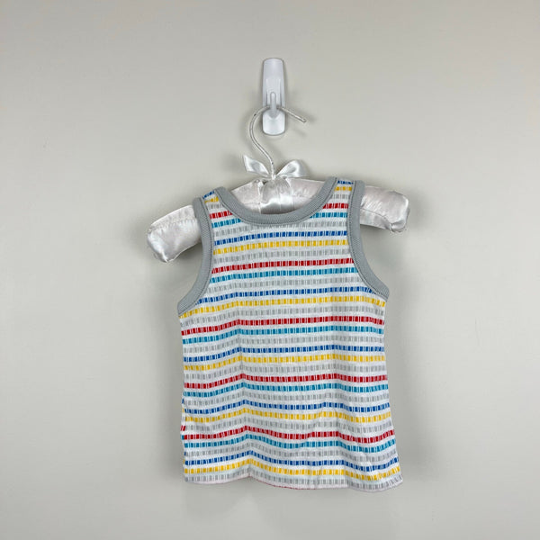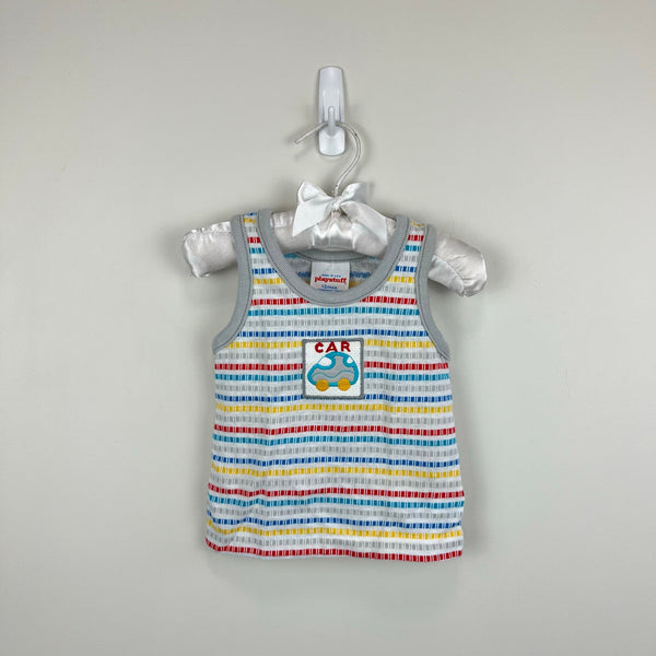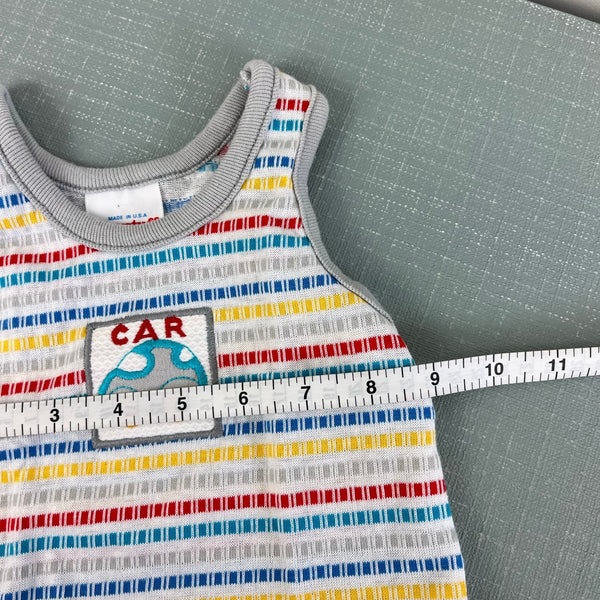 Vintage Play Stuff Car Tank Top. Baby boy or girl size 12 months. USA made. The cutest sleeveless knit shirt. White with gray trim and colorful rainbow stripes. Car patch on the chest. Excellent condition; maybe never worn!