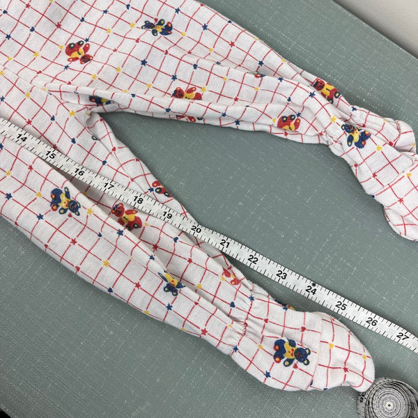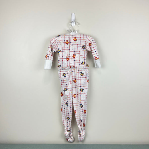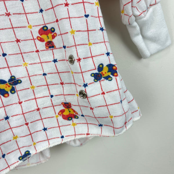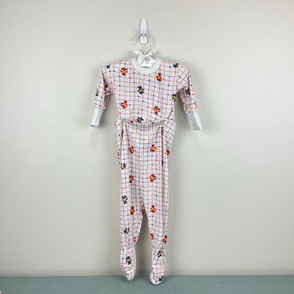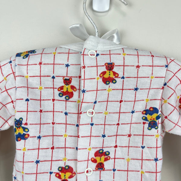 Vintage Trimfit Sleep & Play Teddy Bear Pajama Set. Baby boy or girl size 12 months. USA made. Two piece PJs with long sleeve shirt and footed pants bottom. White and red windowpane plaid with blue and yellow stars and hearts and teddy bear print. Elastic is relaxed, but top snaps to bottoms so a non-issue!