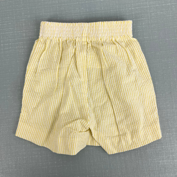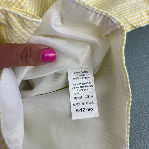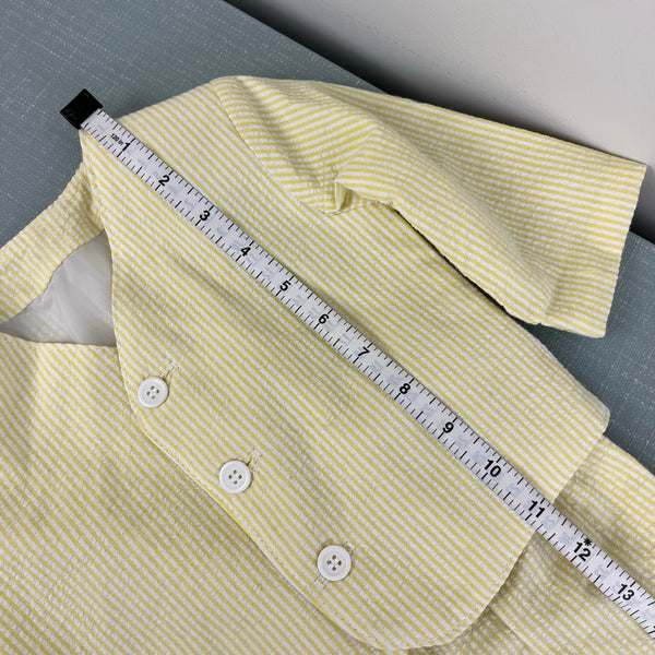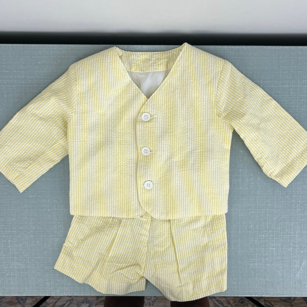Vintage Yellow Seersucker Stripe Suit Jacket Shorts. Baby boy size 6-12 months. (See photos for measurements; looks on the bigger side to me.) USA made. Two piece set includes yellow and white striped blazer and matching elastic waist pull on shorts. Perfect for a summer wedding or party! Excellent condition.