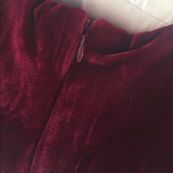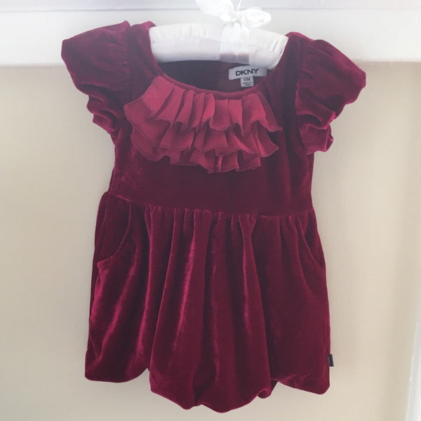 DKNY Crushed Velvet Ruffle Party Dress. Baby girl size 12 months. Soft and flowy dress is perfect for a little one on the move! Cranberry colored crushed velvet with fun layered ruffles at neckline. No necklace needed! Convenient zipper in the back allows for easy dressing. Perfect for Thanksgiving, Christmas, or any special event in the fall or winter!